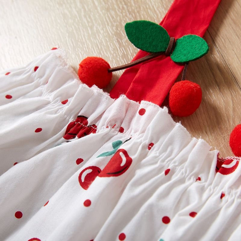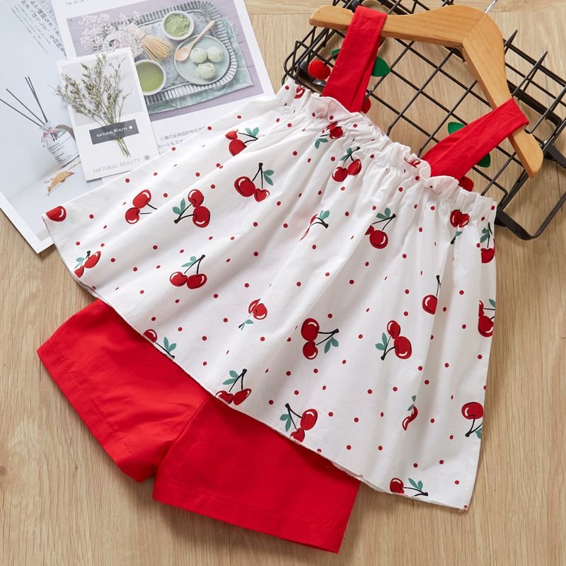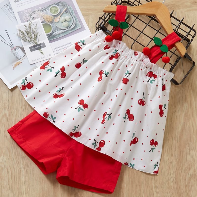2 Pcs Girl Cute Cherry Print Sleeveless Tops And Shorts