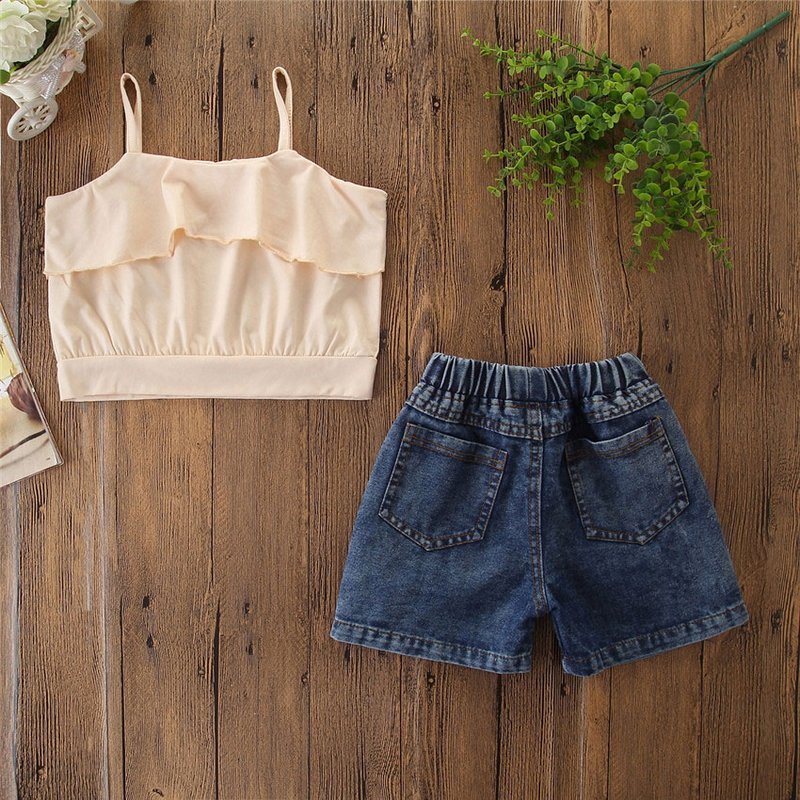 2 Pcs Girl Ruffled Spaghetti Strap Tops And Denim Jeans