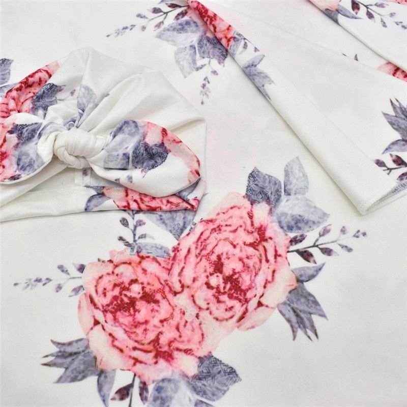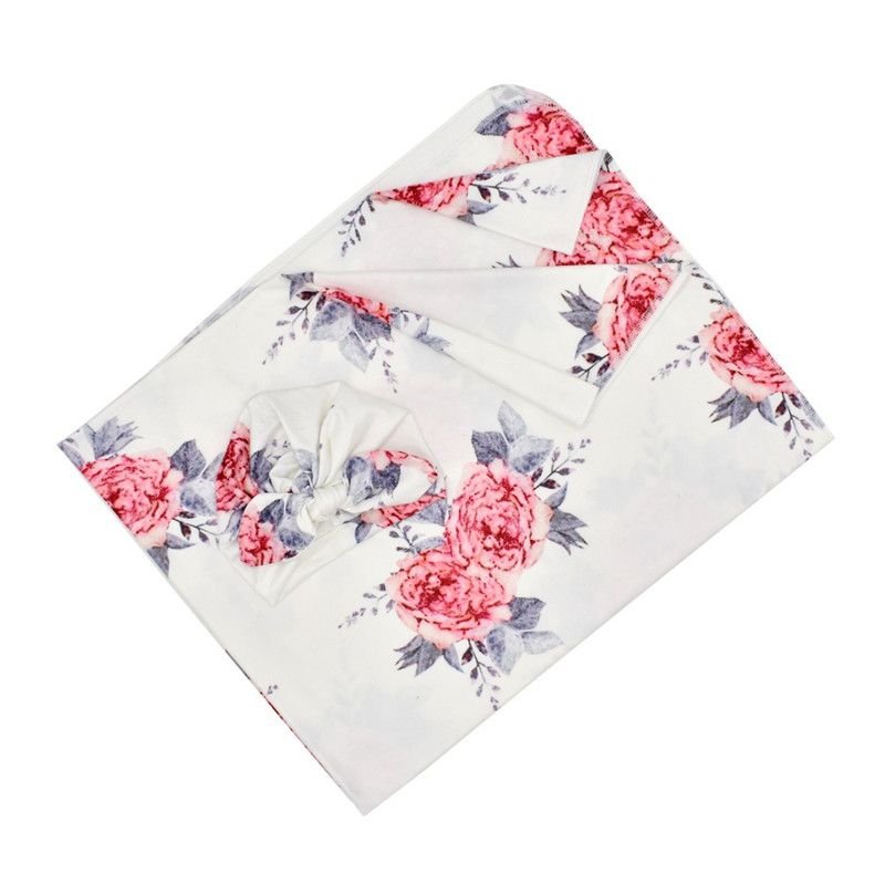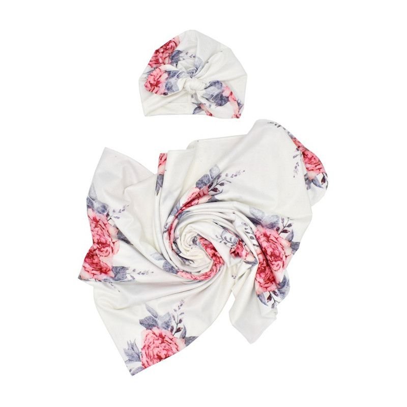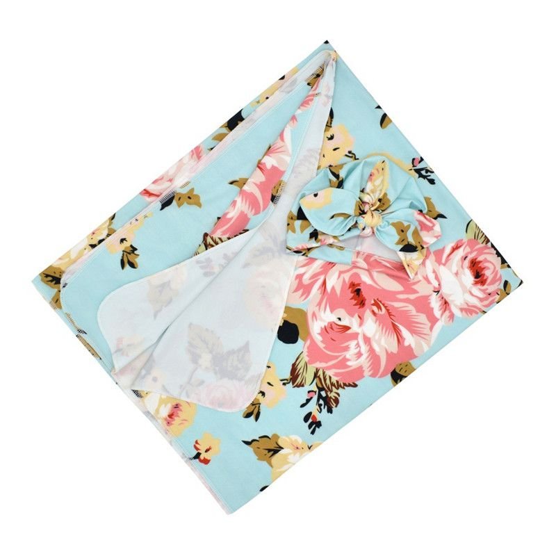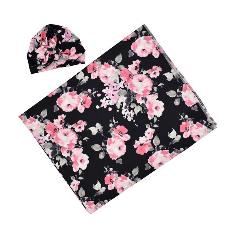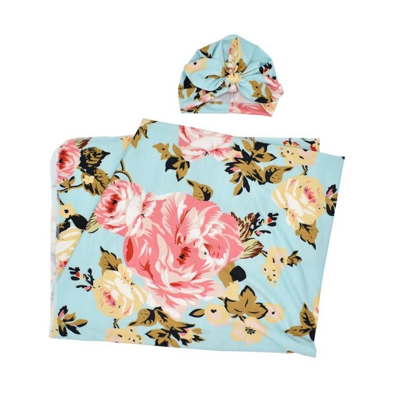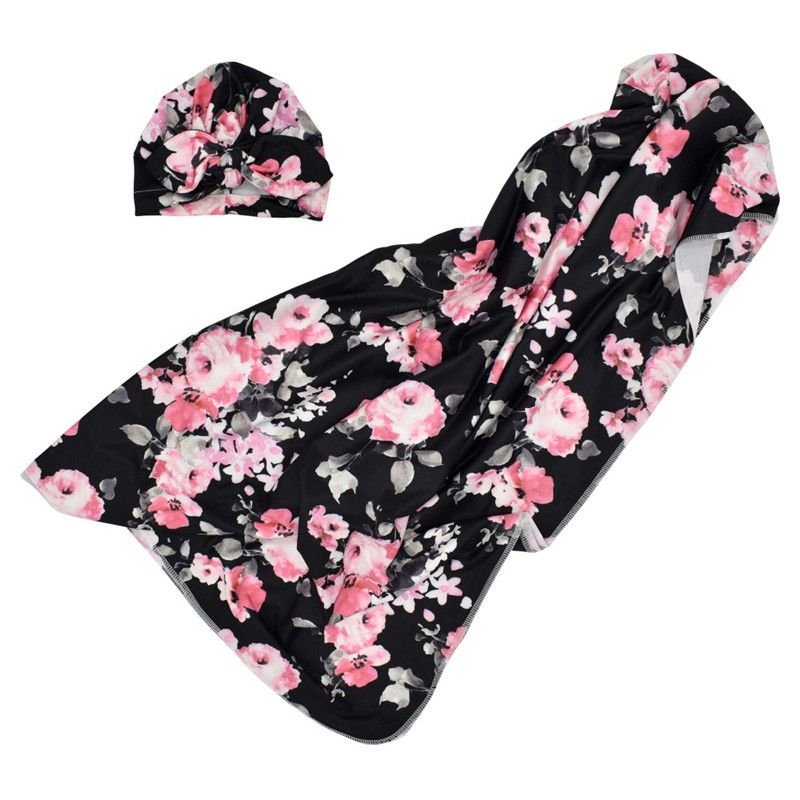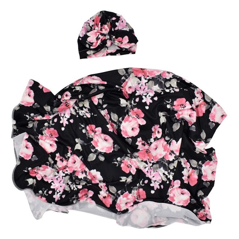 2 Pcs Newborn Baby Floral Print 86*137cm Swaddle Blanket And Turban Hat Set