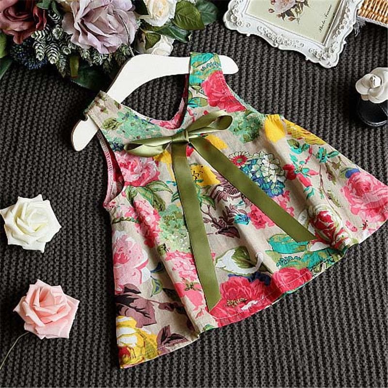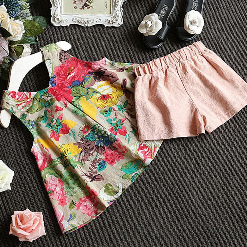 2 Pcs Set Girl Floral Print Sleeveless Tops And Shorts