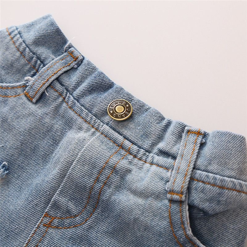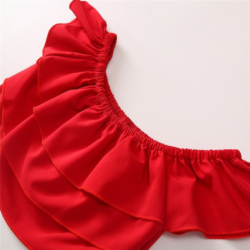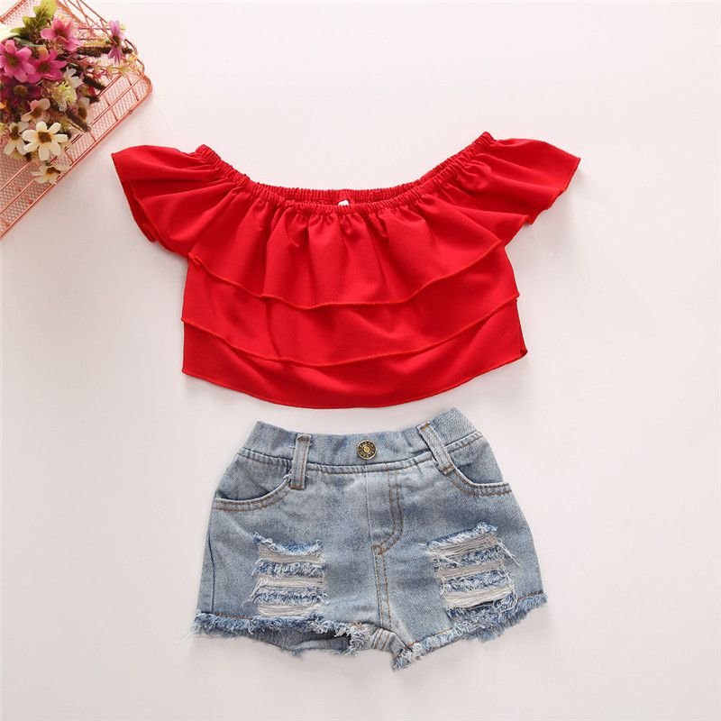 2 Pcs Set Girl Kid Red Ruffle Off-Shoulder Tops And Denim Shorts