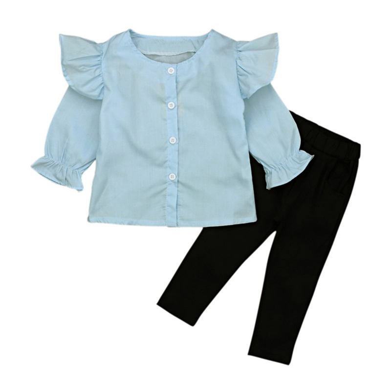 2 Pcs Set Girls Round Neck Flare Sleeves Blouse And Black Pants