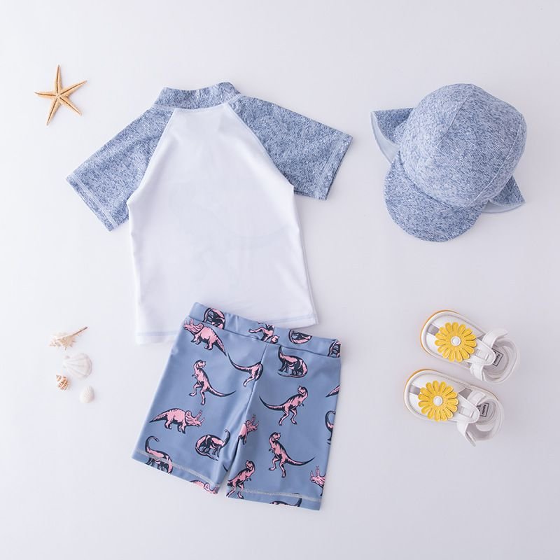 3 Pcs Boys Dinosaur Printed Swimsuit And Cap