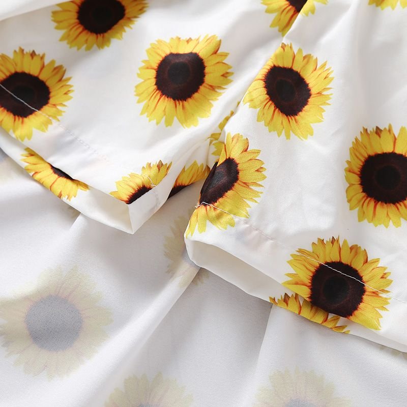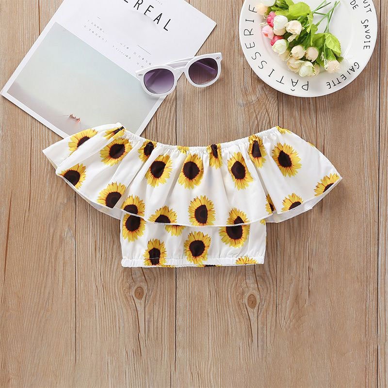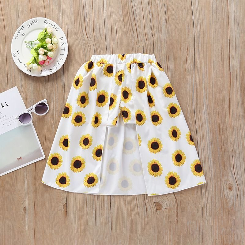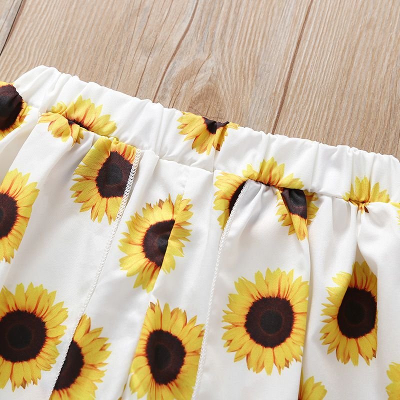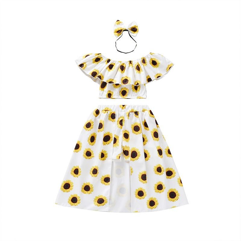 3 Pcs Girls Ruffled Sunflower Print Tops And Swallowtail Skirt And Headwear Set