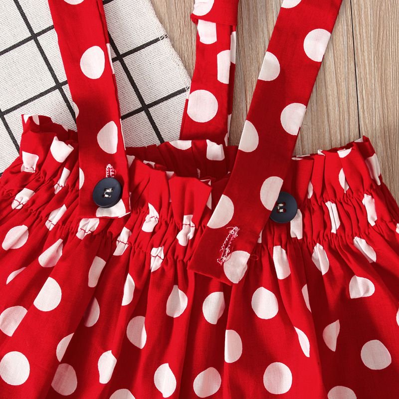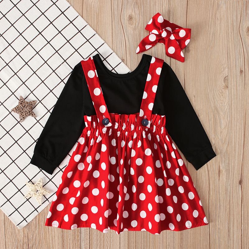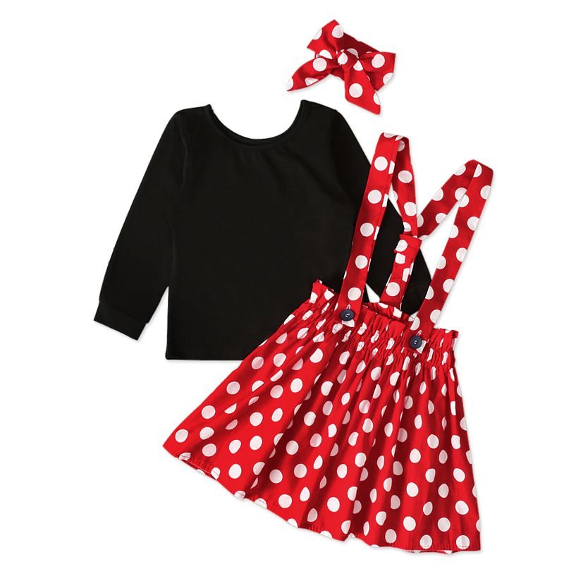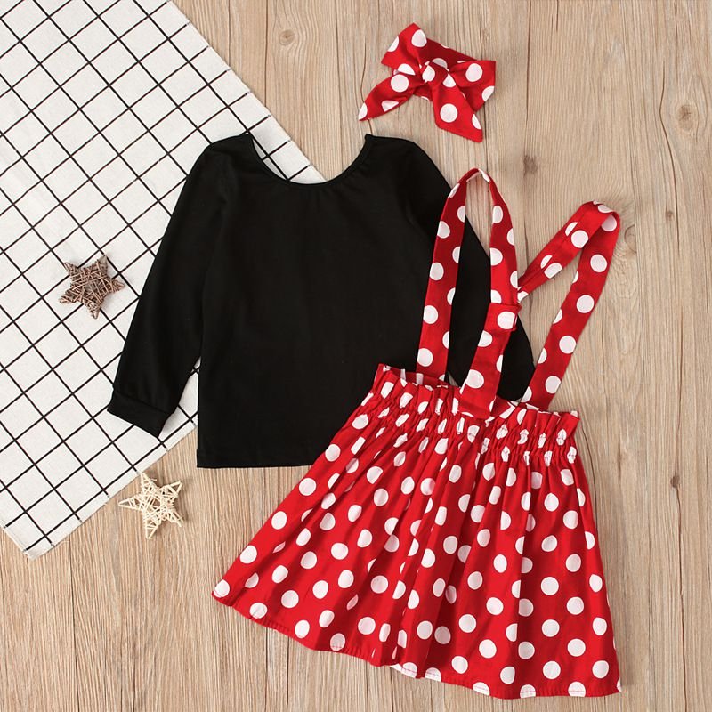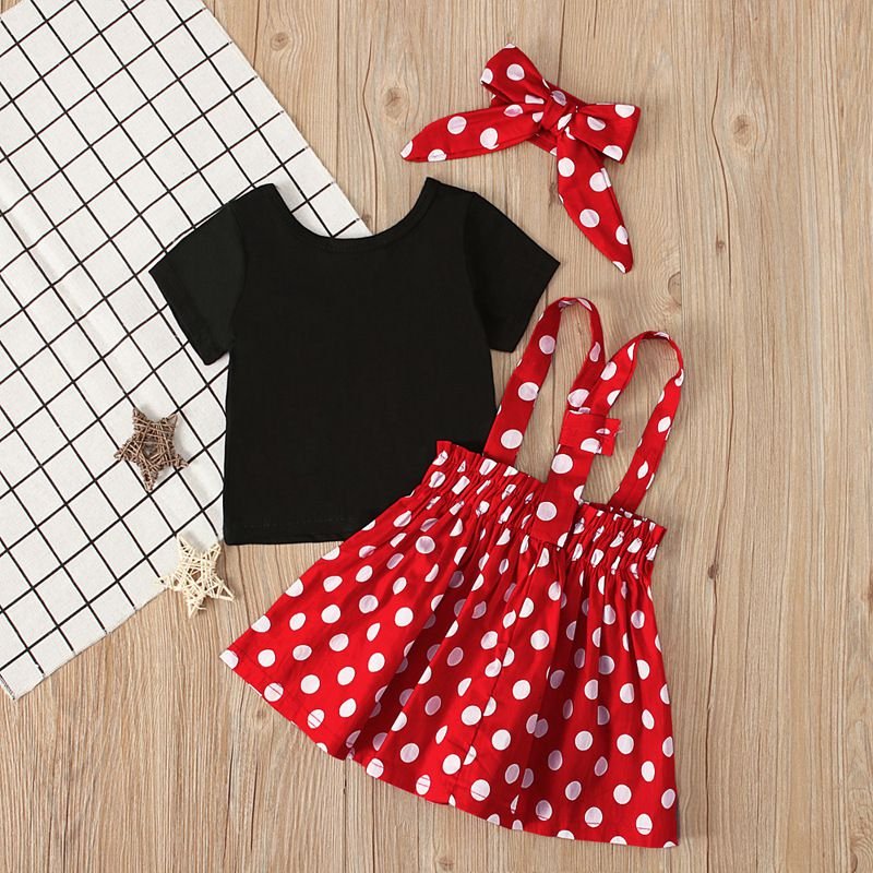 3 Pcs Set Cute Girl Black T-Shirts And Dots Print Overall Dresses With Headband