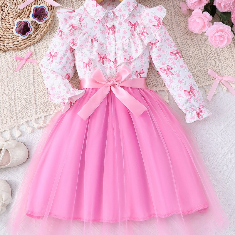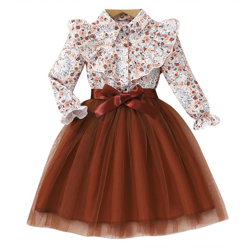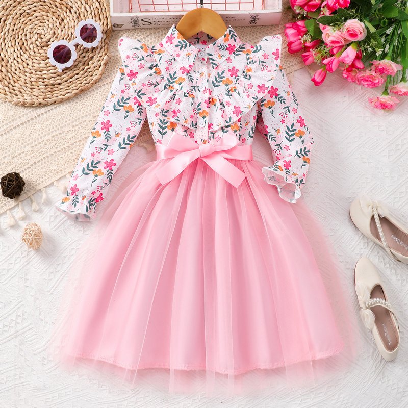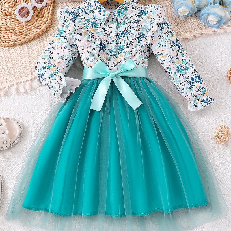 Autumn And Winter Girls Fashion Floral Printing Long Sleeve Mesh Dress