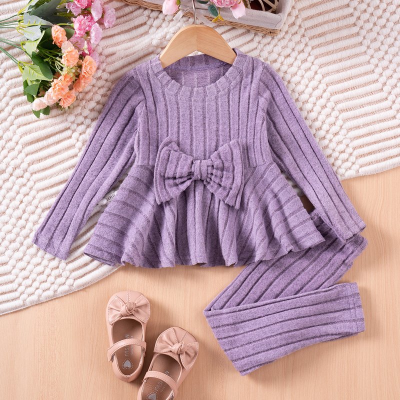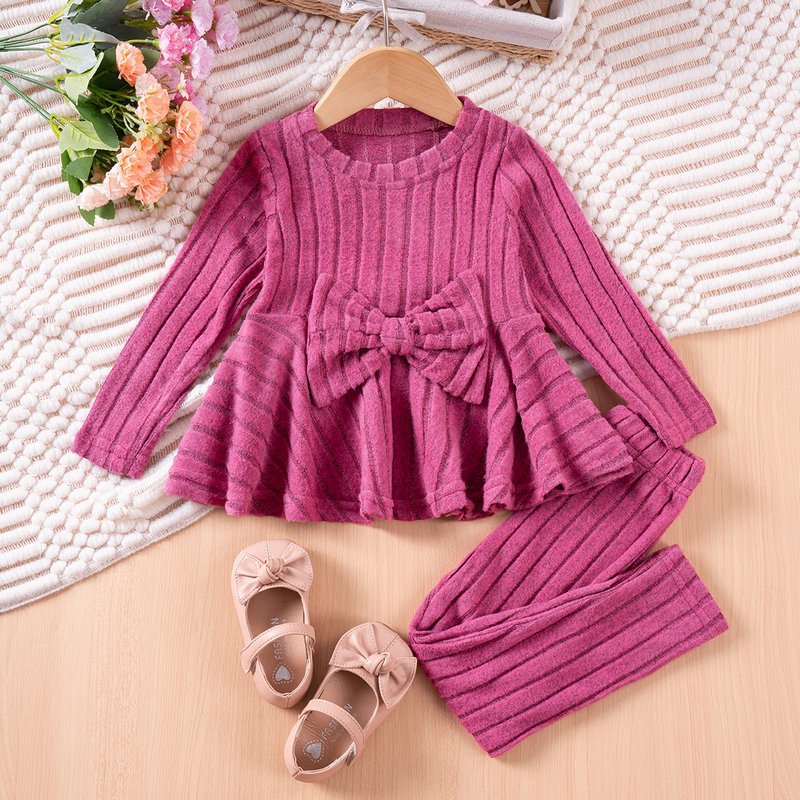 Autumn And Winter Girls Fashion Solid Color Bow Long Sleeve Top And Pants Two-Piece Set