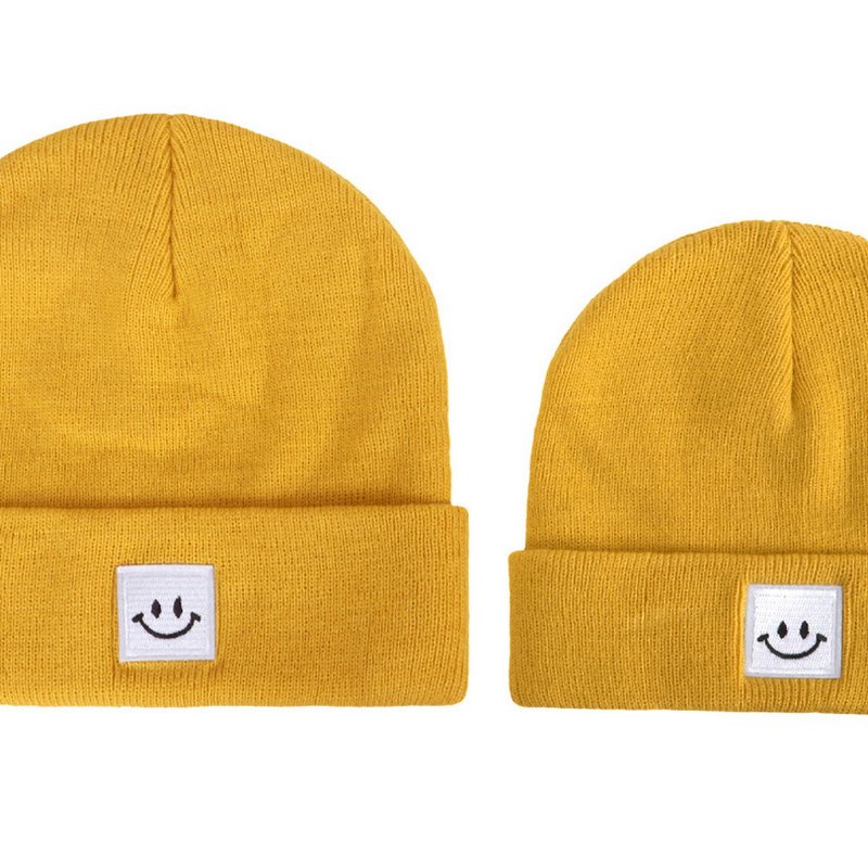 Autumn Winter Simple Solid Color Smiley Label Warm Knitted Parent-Child Wool Hat Set