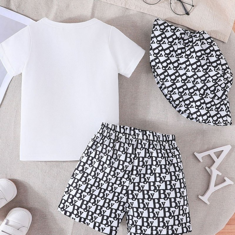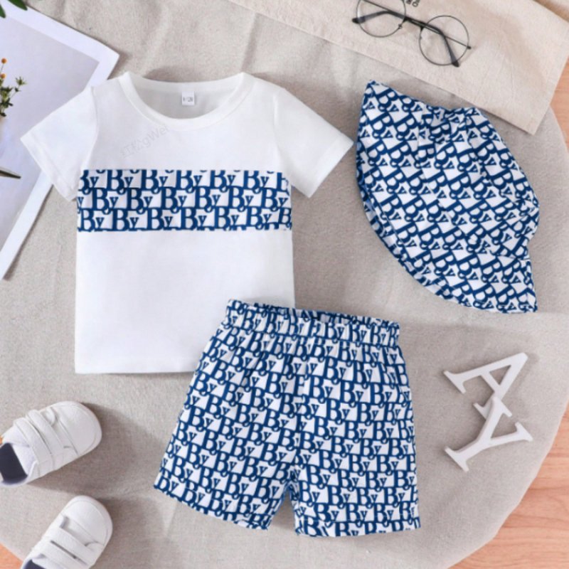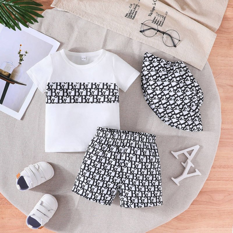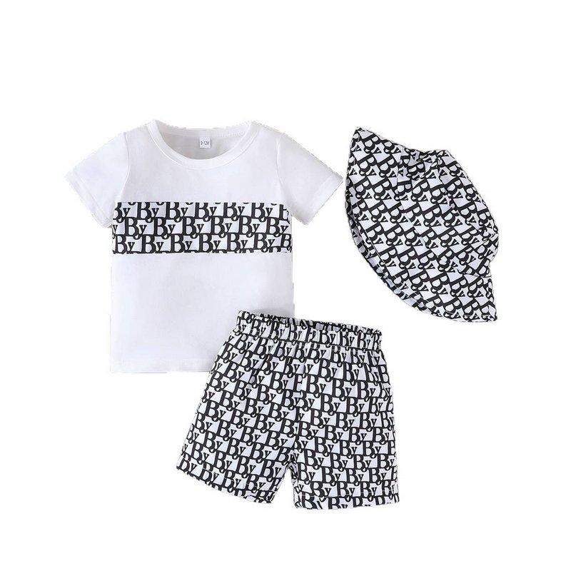 Baby Boy Fashion Casual Printed Short Sleeve T-Shirt Loose Shorts Hat Three Piece Set
