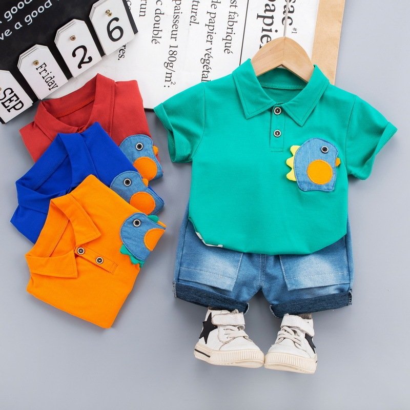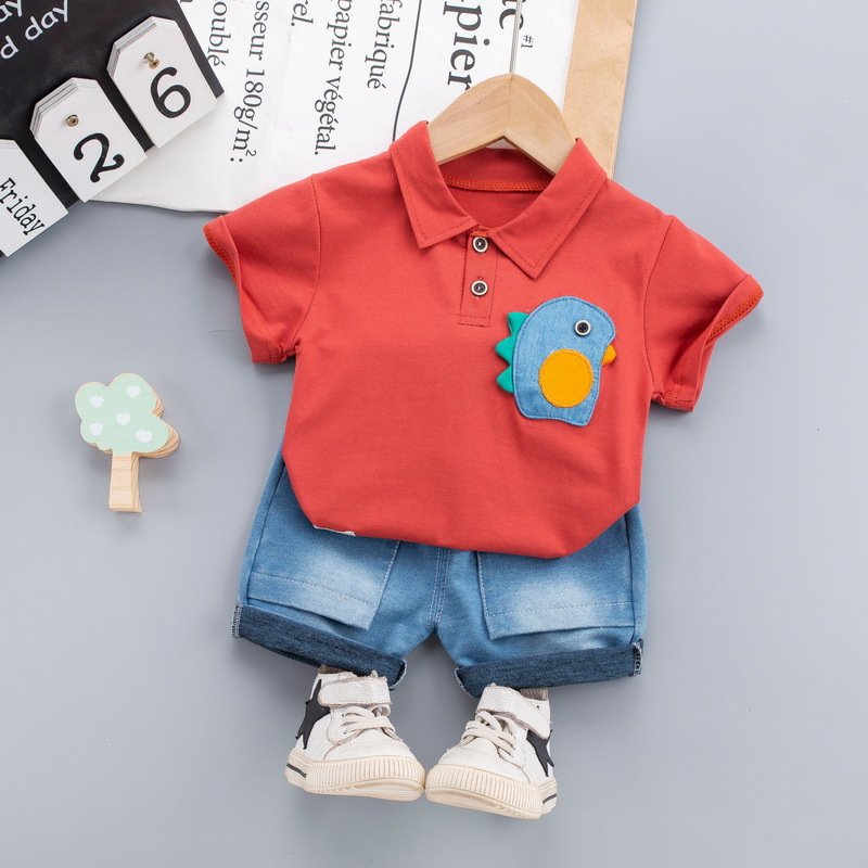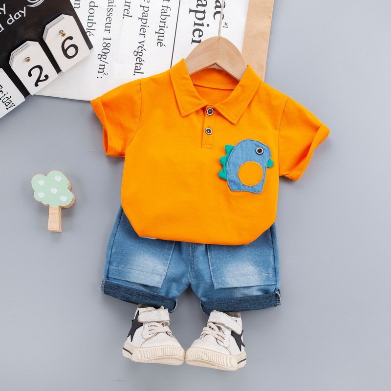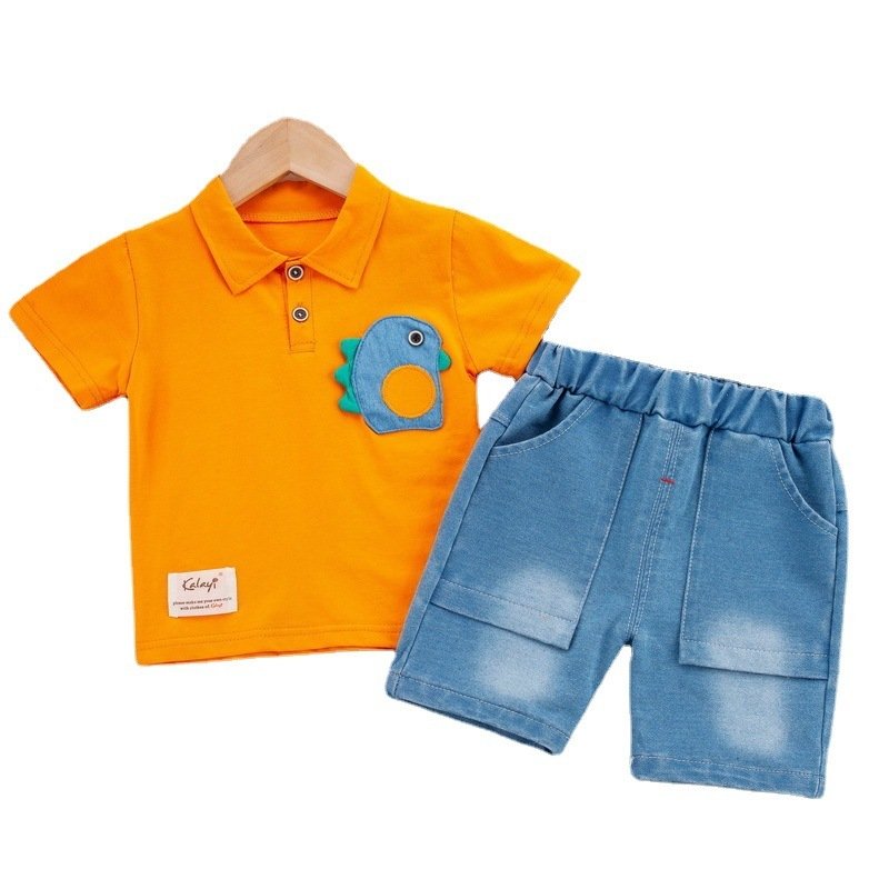 Baby Boys Basic Lapel Polo Shirt Short-sleeved Casual T-Shirt And Denim Elastic Shorts Two-piece Set