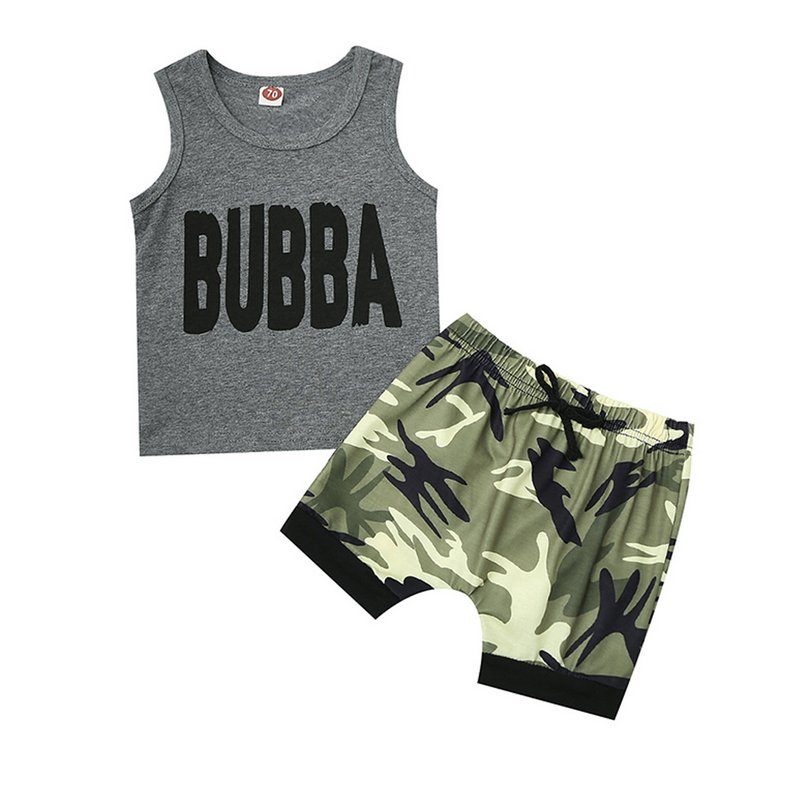 Baby Boys Basic Round Neck Letter Sleeveless Vest And Elastic Camouflage Shorts Set