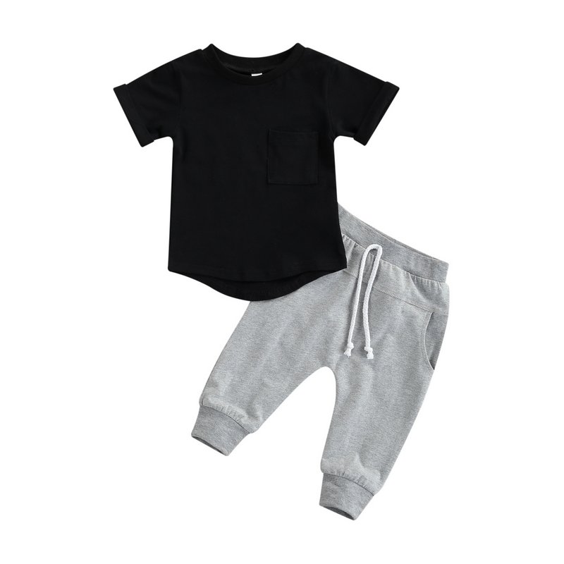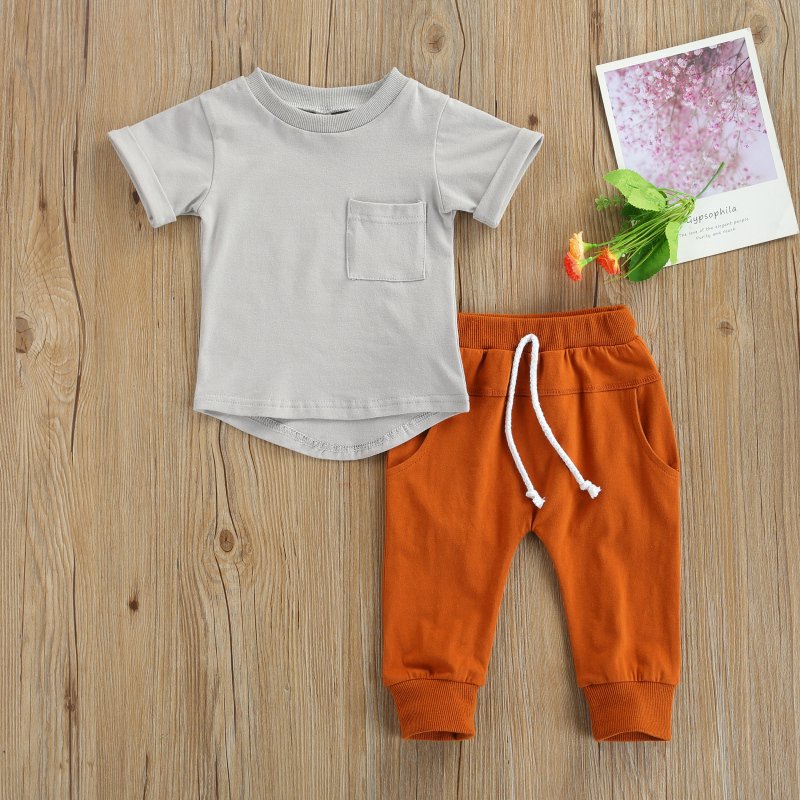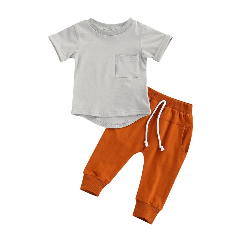 Baby Boys Basic Round Neck Short Sleeve Solid Color Pocket T-Shirt And Elastic Pants Set