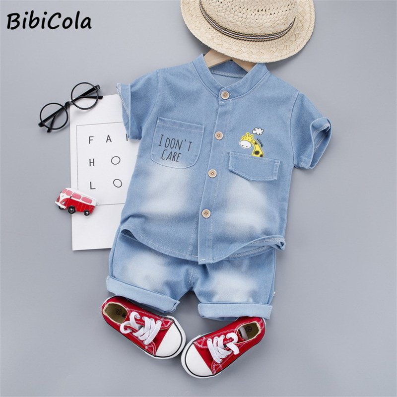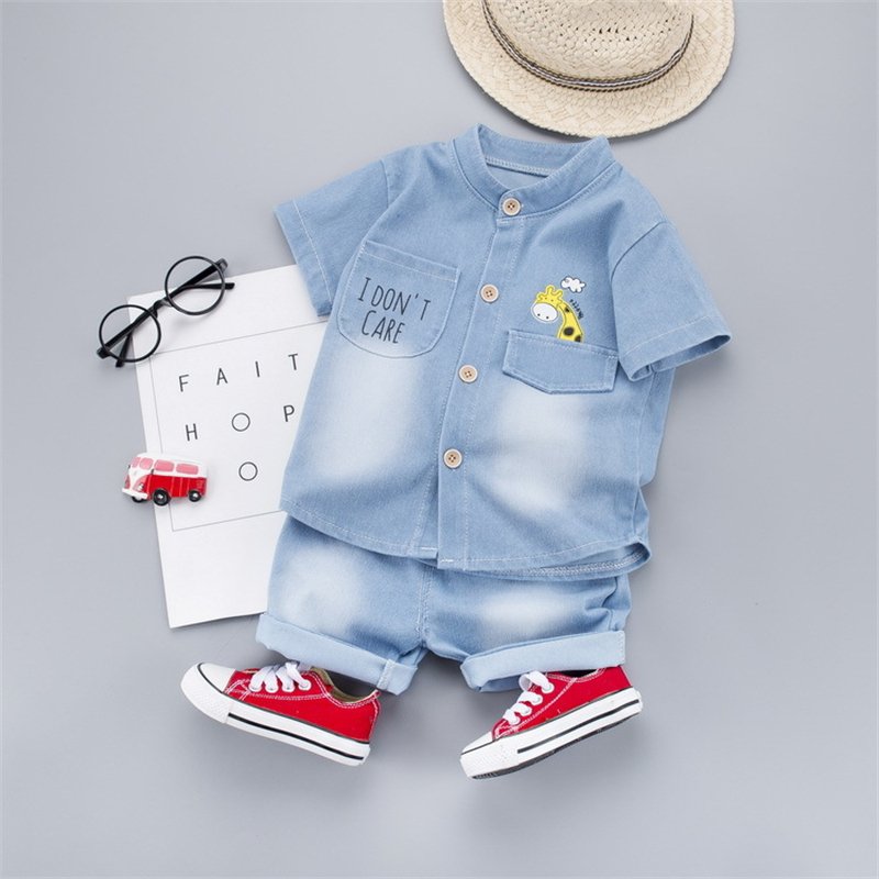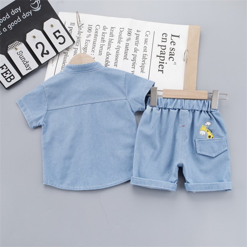 Baby Boys Casual Short Sleeve Single-breasted Cartoon Giraffe Denim Shirt And Elastic Shorts Set
