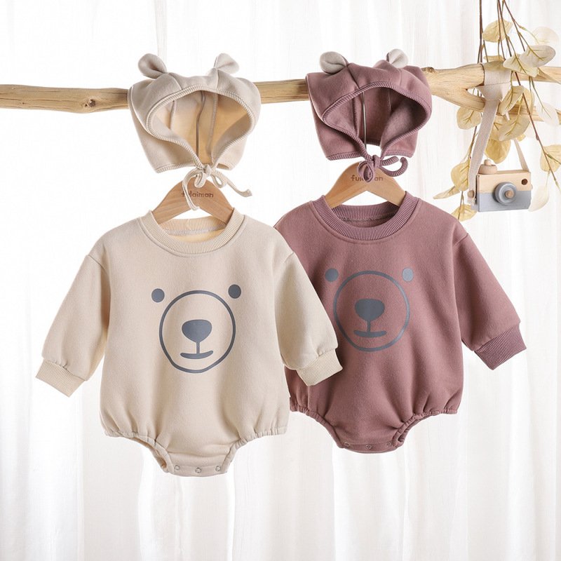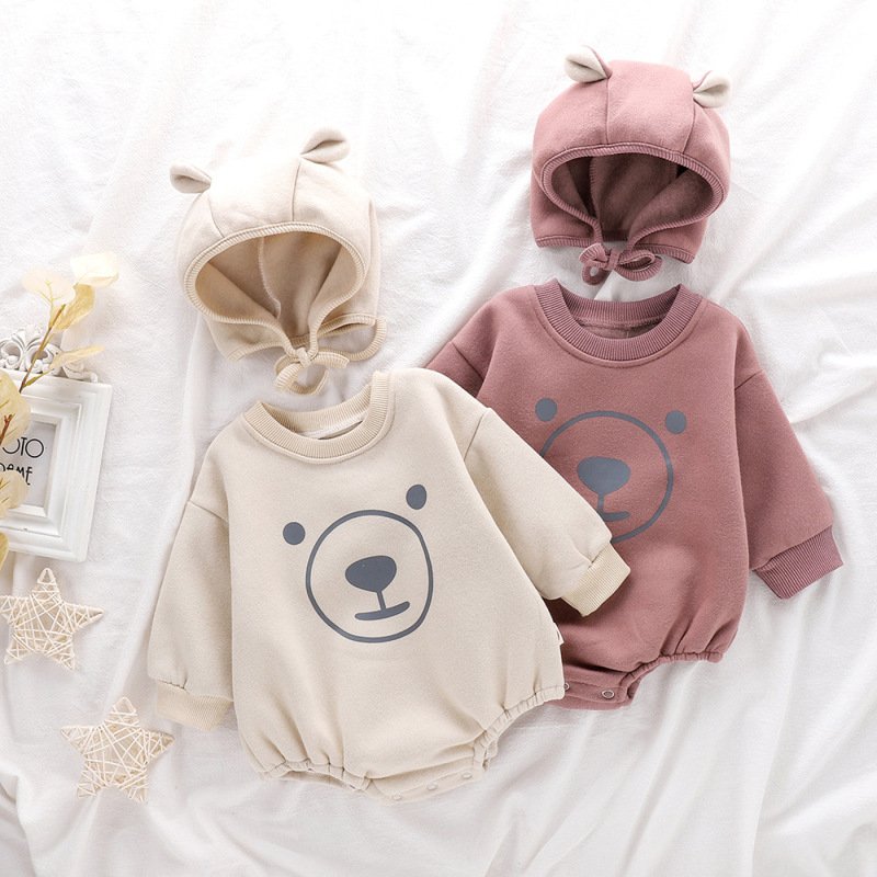 Baby Casual Cartoon Bear Pattern Round Neck Long Sleeve Plush Romper With Hat Set