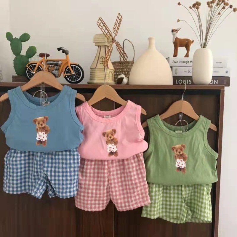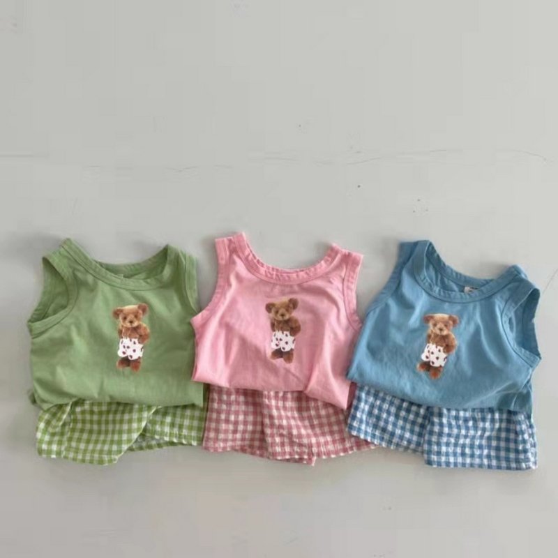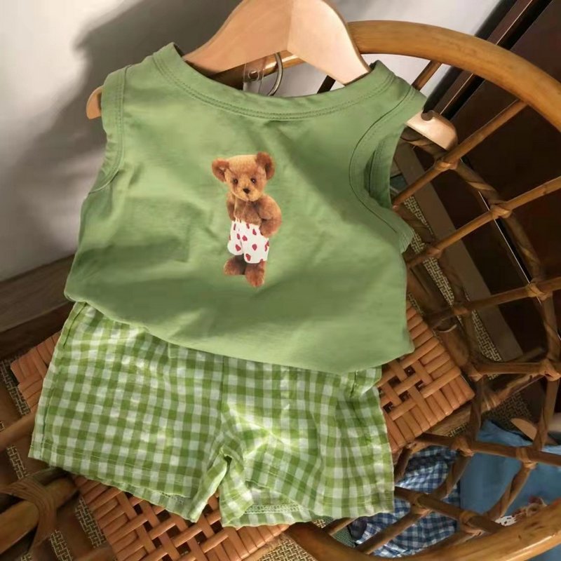 Baby Casual Cartoon Pattern Round Neck Short Sleeve Veat And Elastic Waist Plaid Shorts Set