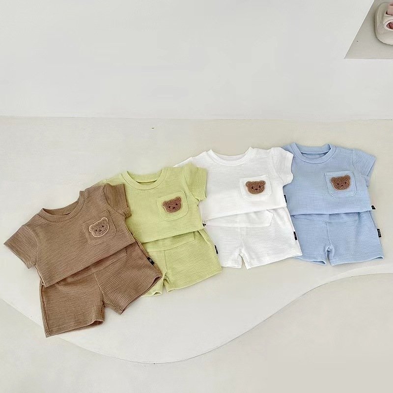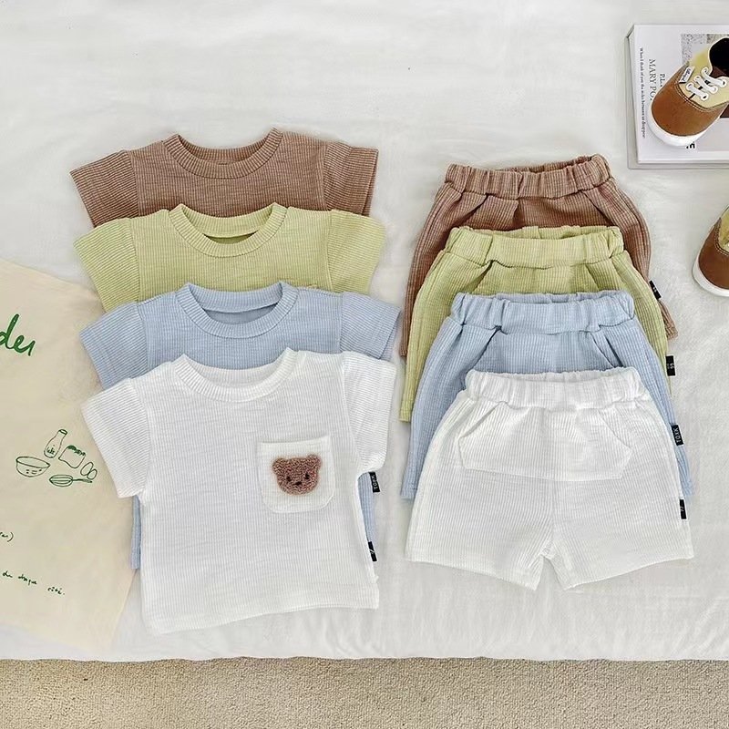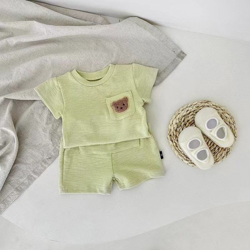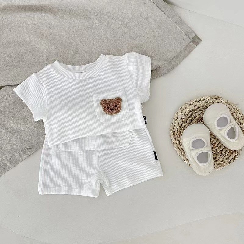 Baby Cute Cartoon Bear Round Neck Short Sleeve T-Shirt And Elastic Waist Shorts Set