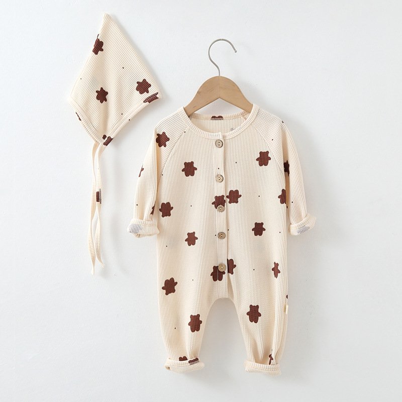 Baby Cute Round Neck Long Sleeve Bear All Over Print Single-breasted Jumpsuit With Hat