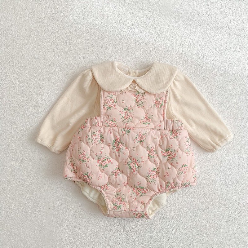 Baby Girl Fashion Fleece-Lined Lapel Long-Sleeve Top Floral Printed Rompers Two-Piece Set