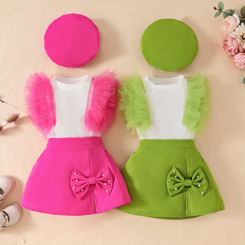 Baby Girl Fashion Mesh Ruffled Top And Skirt Hat Three-Piece Set