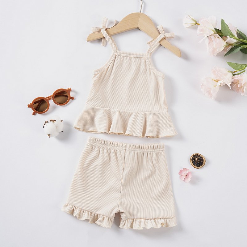 Baby Girl Fashion Solid Color Sleeveless Ruffled Camisole Loose Shorts Two-Piece Set