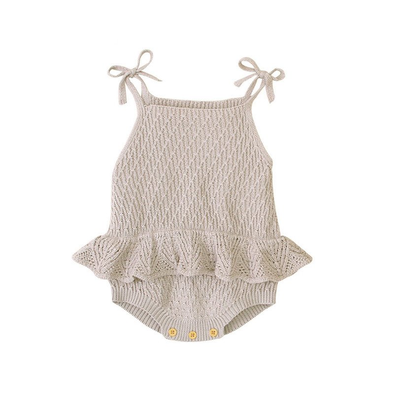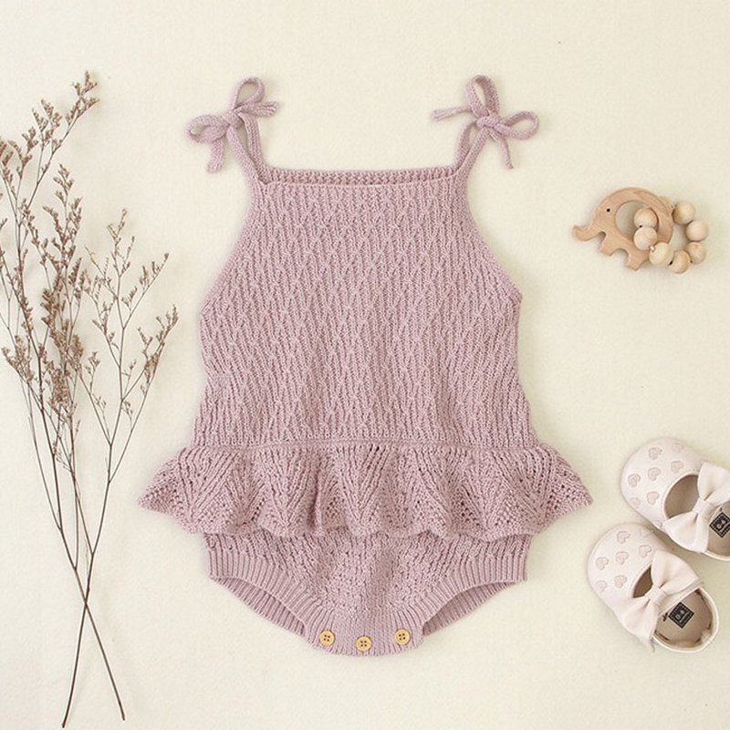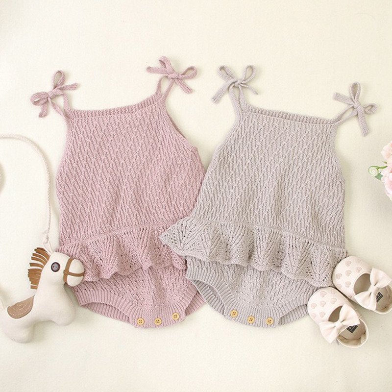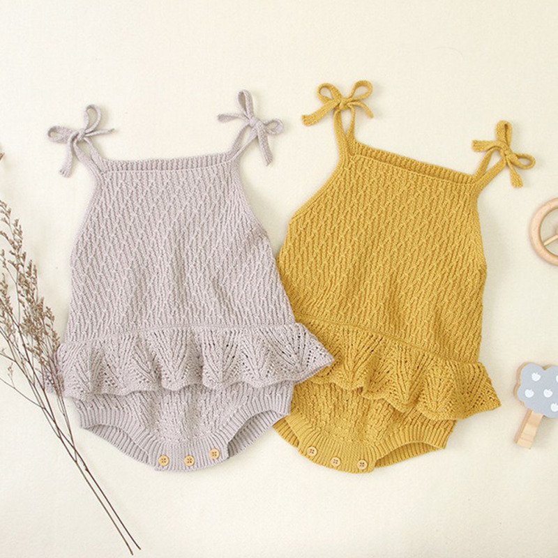 Baby Girls Basic Solid Color Ruffled Knitted Strap Romper