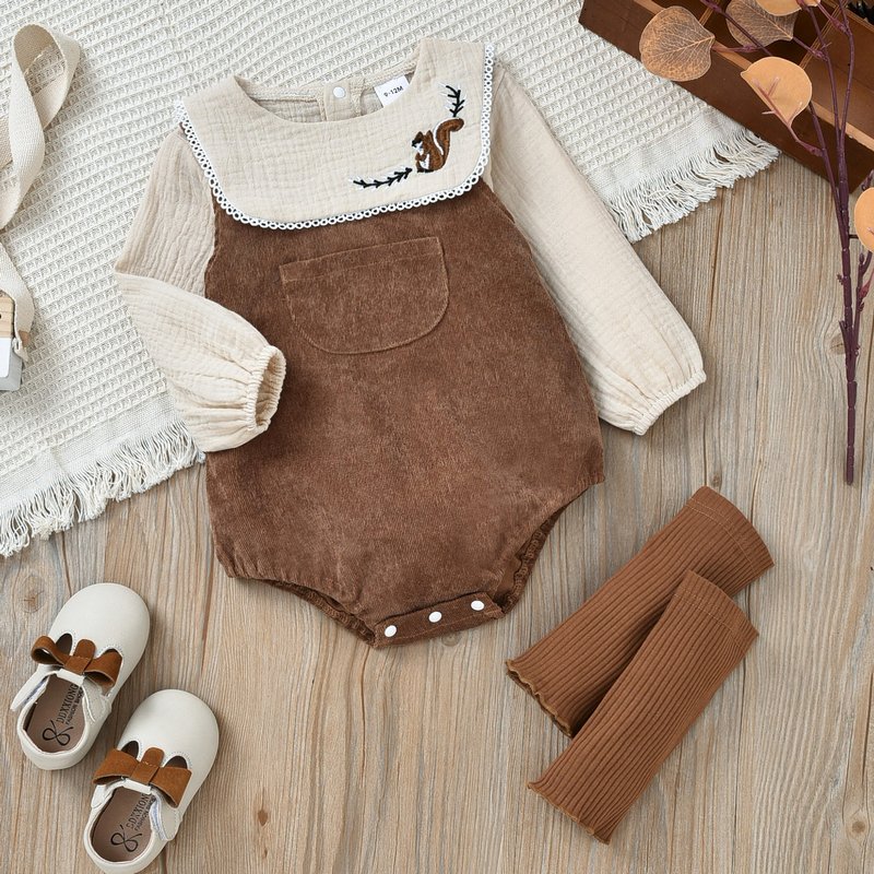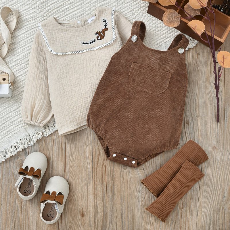Baby Girls Basic Squirrel Embroidery Round Neck Long Sleeve T-Shirt And Sleeveless Romper With Leg Warmers Set