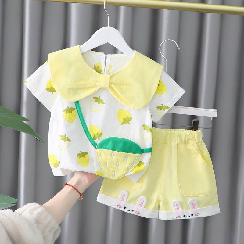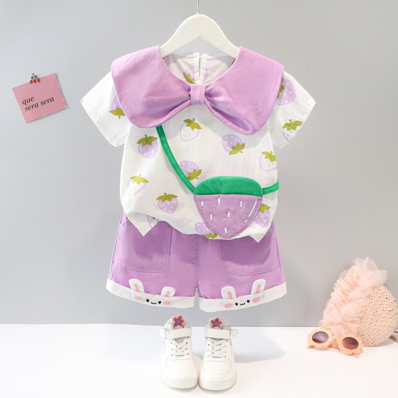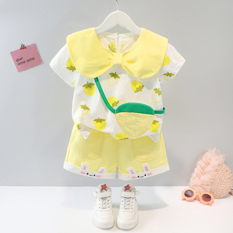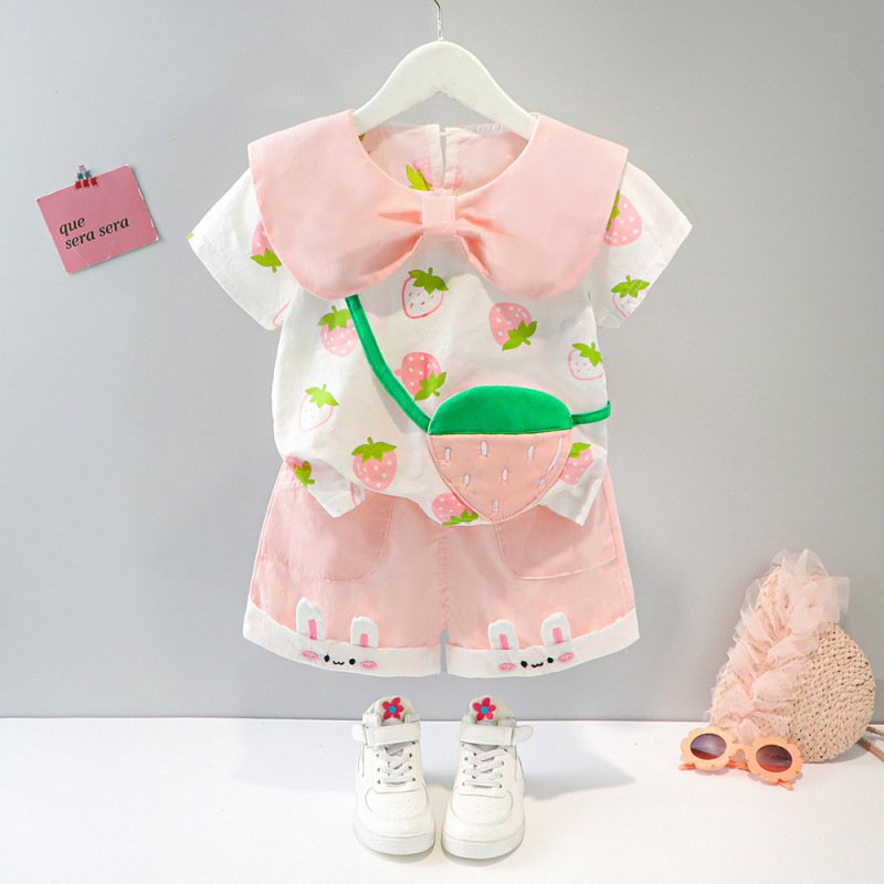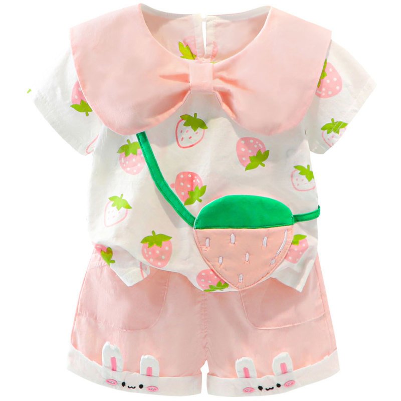 Baby Girls Cute Cartoon Strawberry Pattern Bow Lapel Neck Design Short Sleeve Fake Bag Decor Loose T-Shirt And Elastic Shorts Set