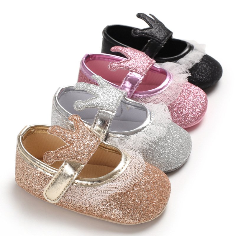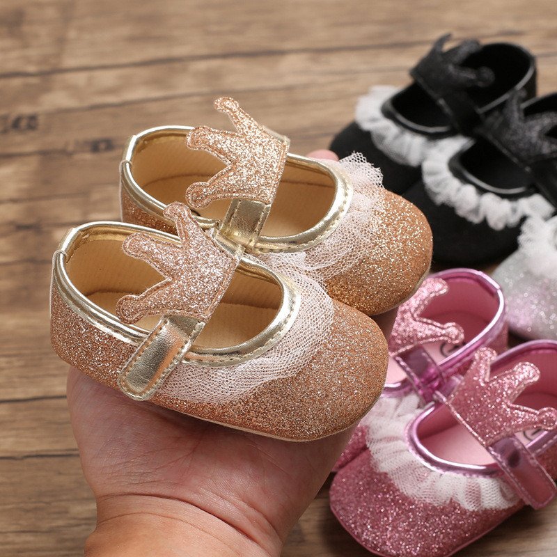 Baby Girls Cute Crown Sequin Lace Design Soft Sole Non-slip Velcro Flats