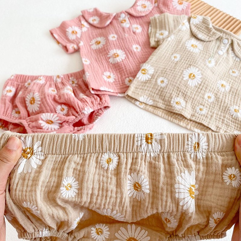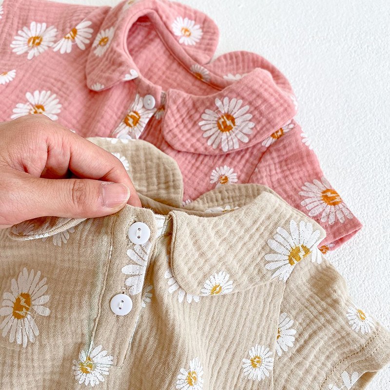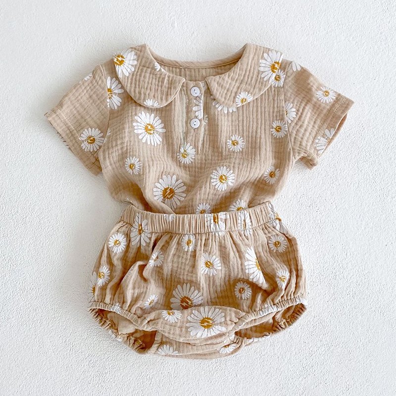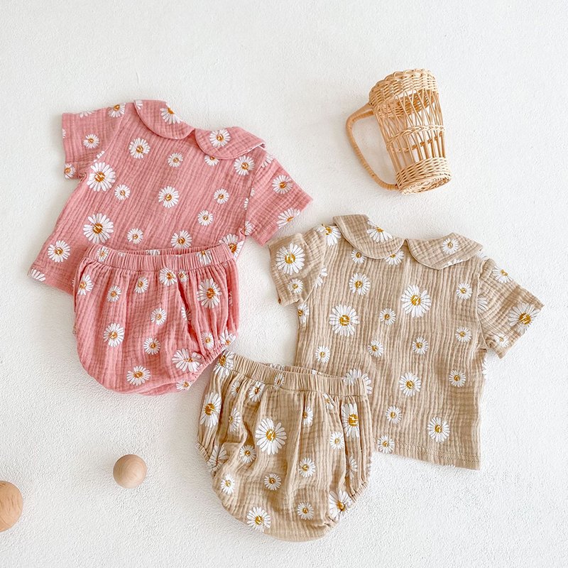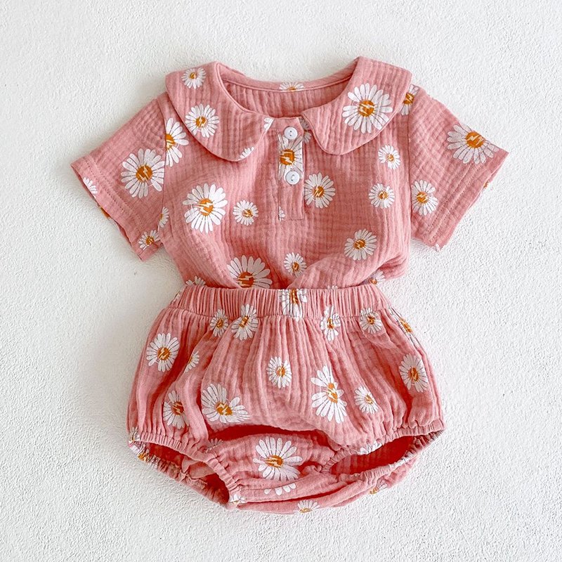 Baby Girls Cute Lapel Short Sleeve Daisy All Over Print T-Shirt And Elastic Shorts Sets
