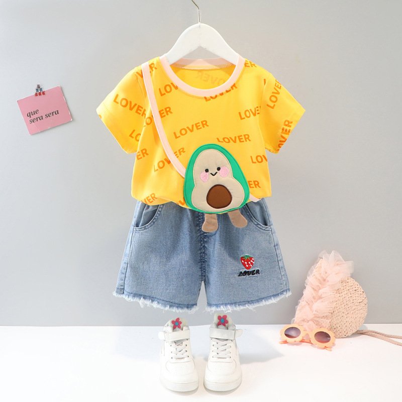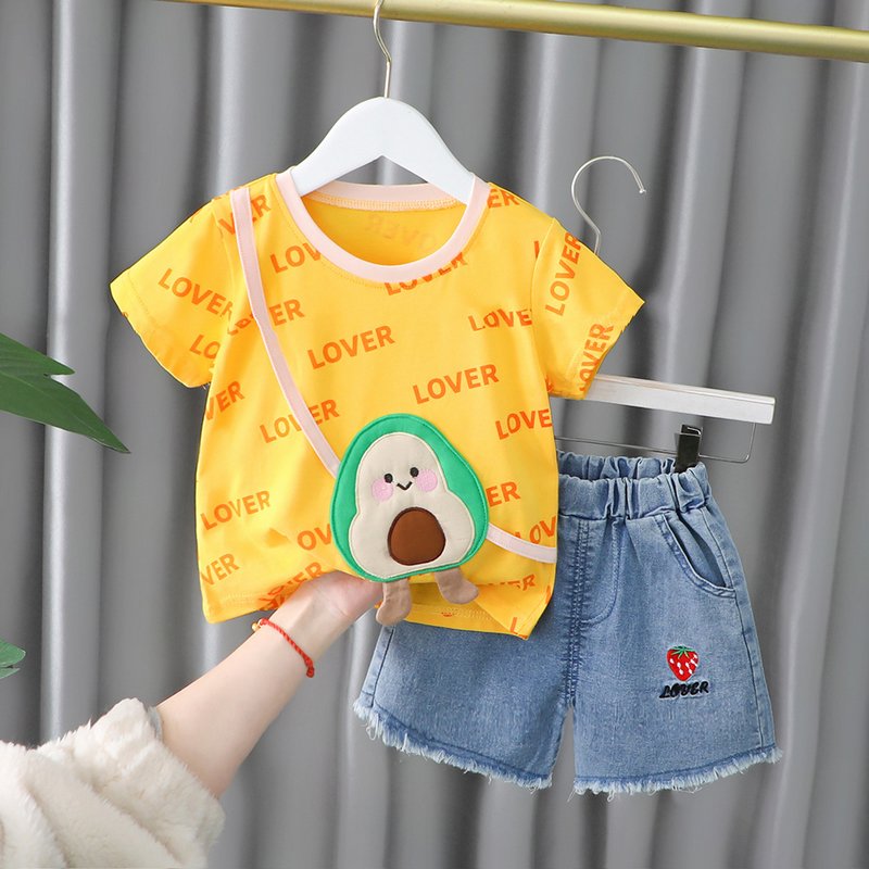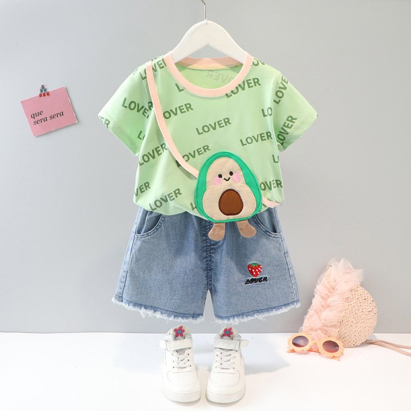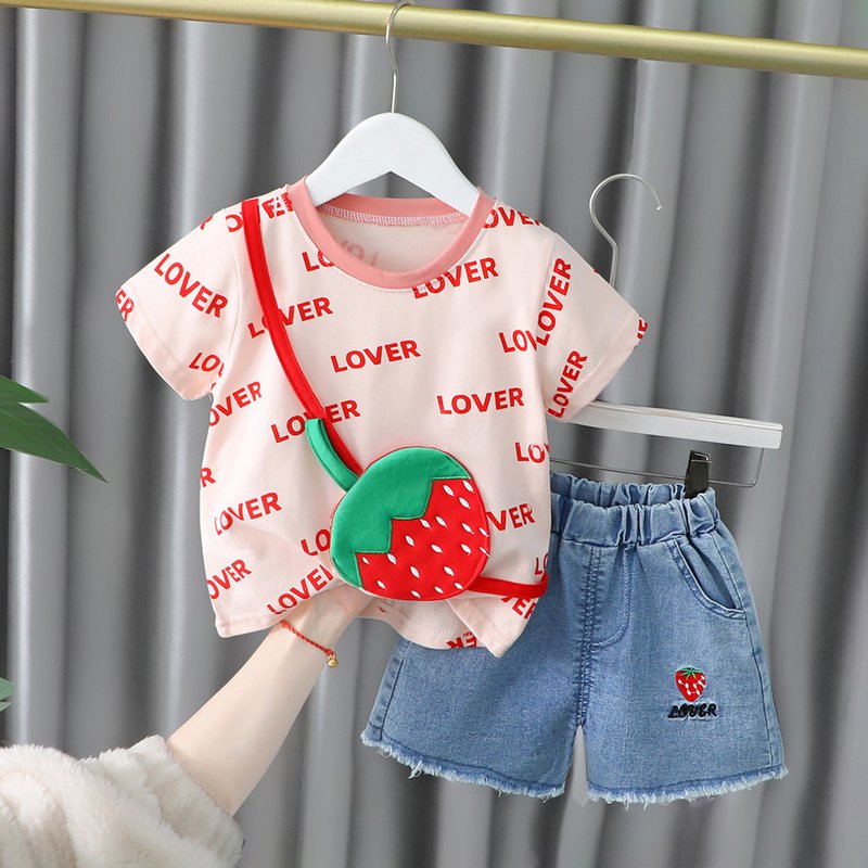 Baby Girls Cute Letter All Over Print Round Neck Short Sleeve Fake Bag Design Loose T-Shirt And Elastic Denim Shorts Set