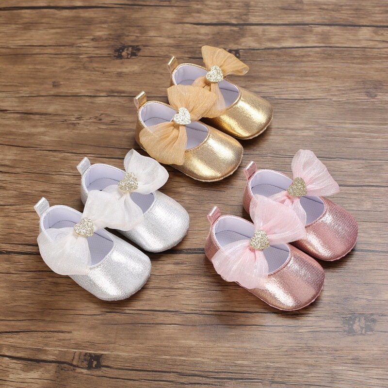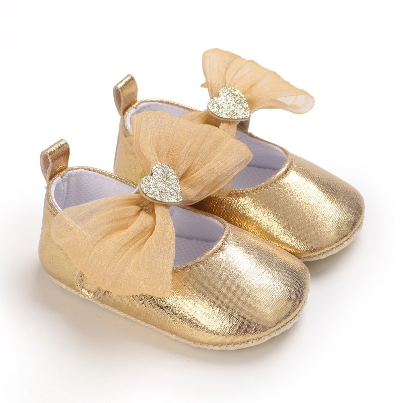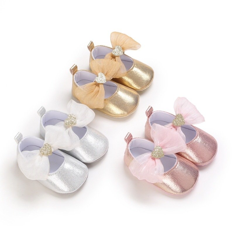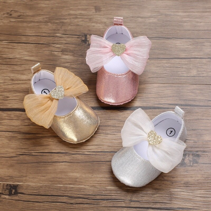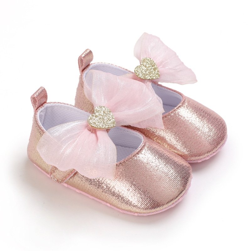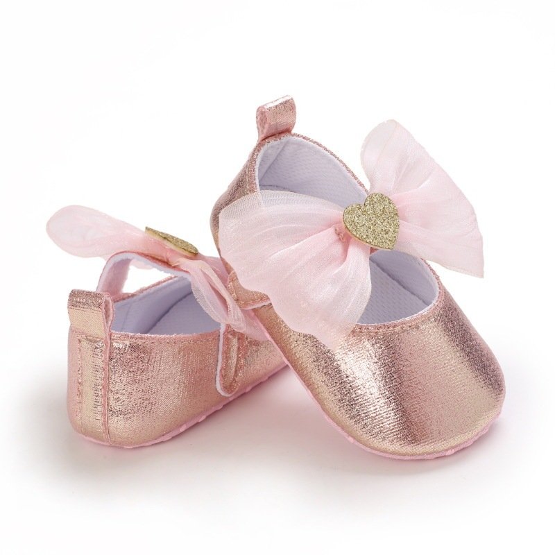 Baby Girls Cute Mesh Bow Heart Glitter PU Soft Bottom Princess Shoes