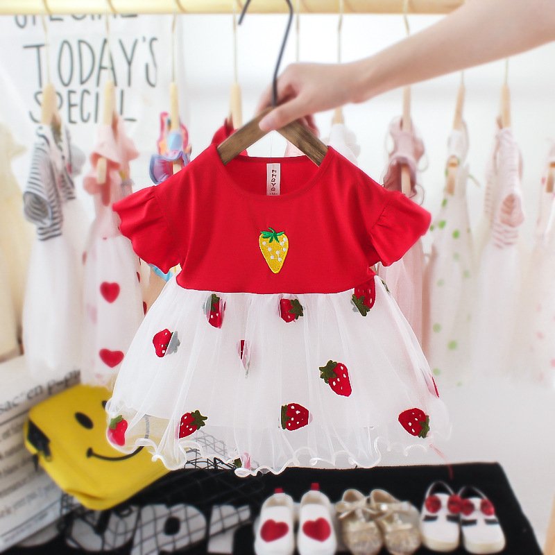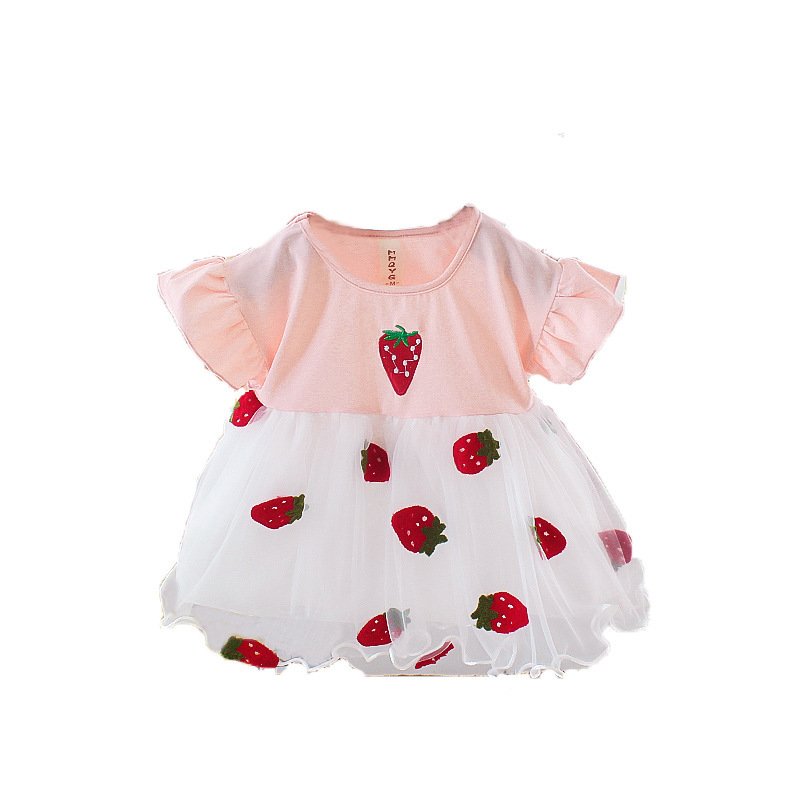 Baby Girls Cute Round Neck Short Sleeve Stringy Selvedge Strawberry Mesh Dress