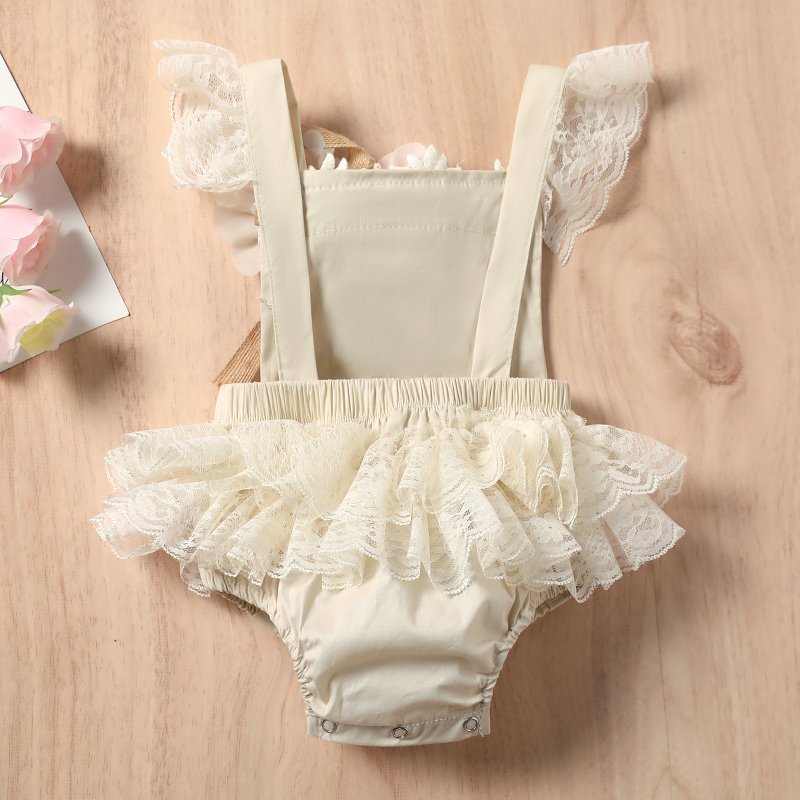 Baby Girls Cute Ruffled Fly Sleeve Flowers Lace Solid Color Backless Romper