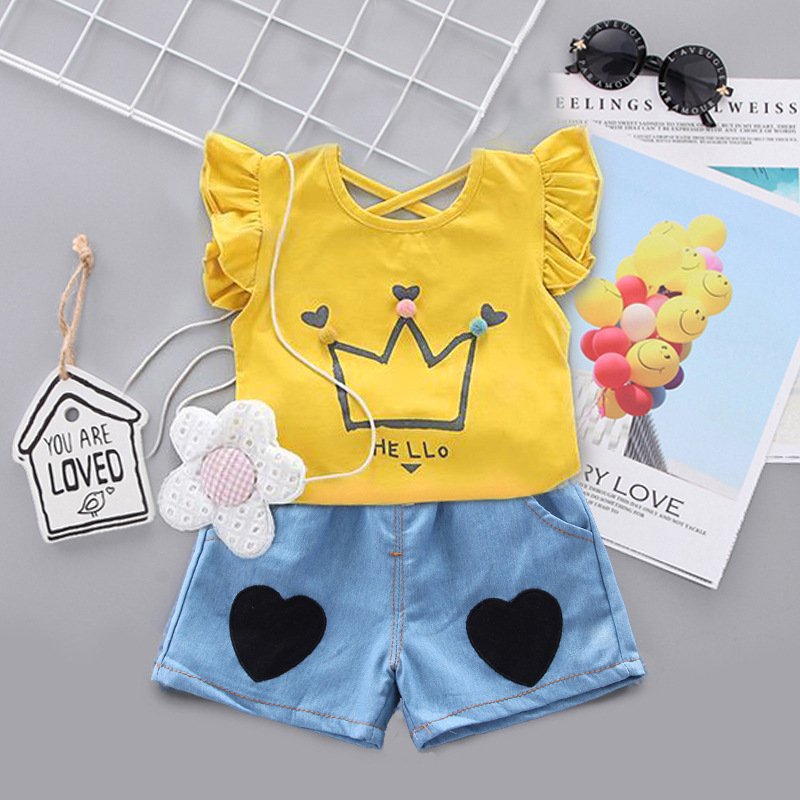 Baby Girls Cute Stringy Selvedge Crown Pompon T-Shirt And Denim Shorts Set