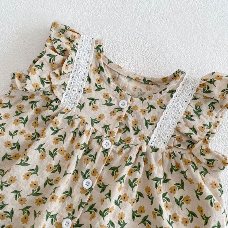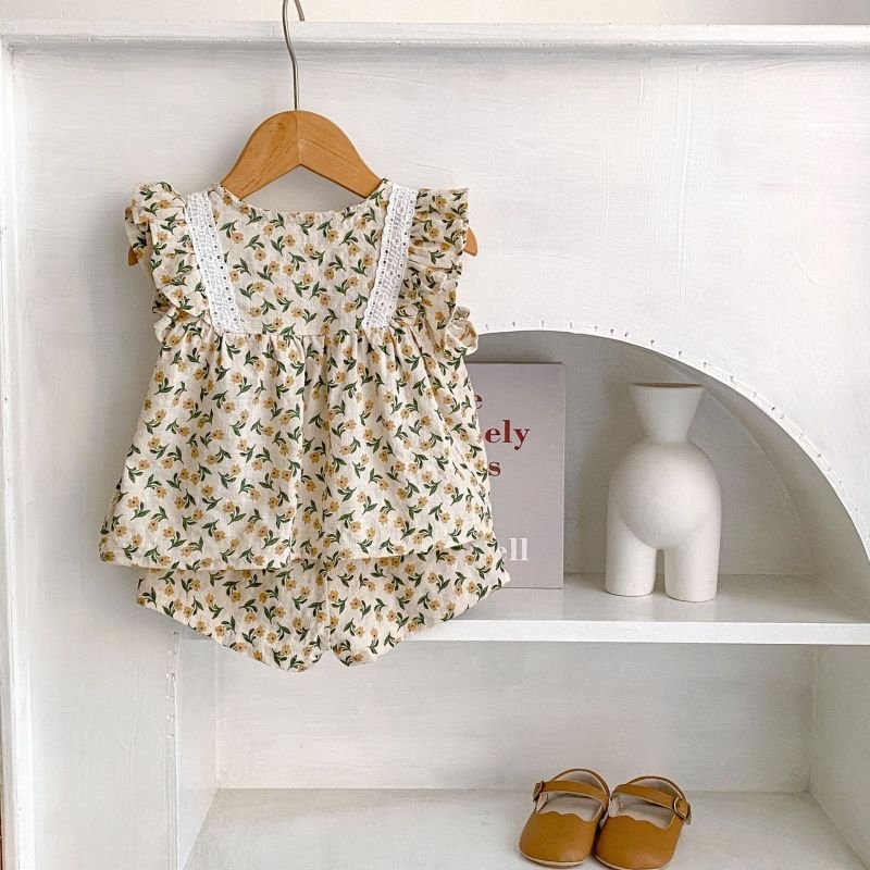Baby Girls Floral Lace Ruffle Sleeve Top Shorts Two-Piece Set