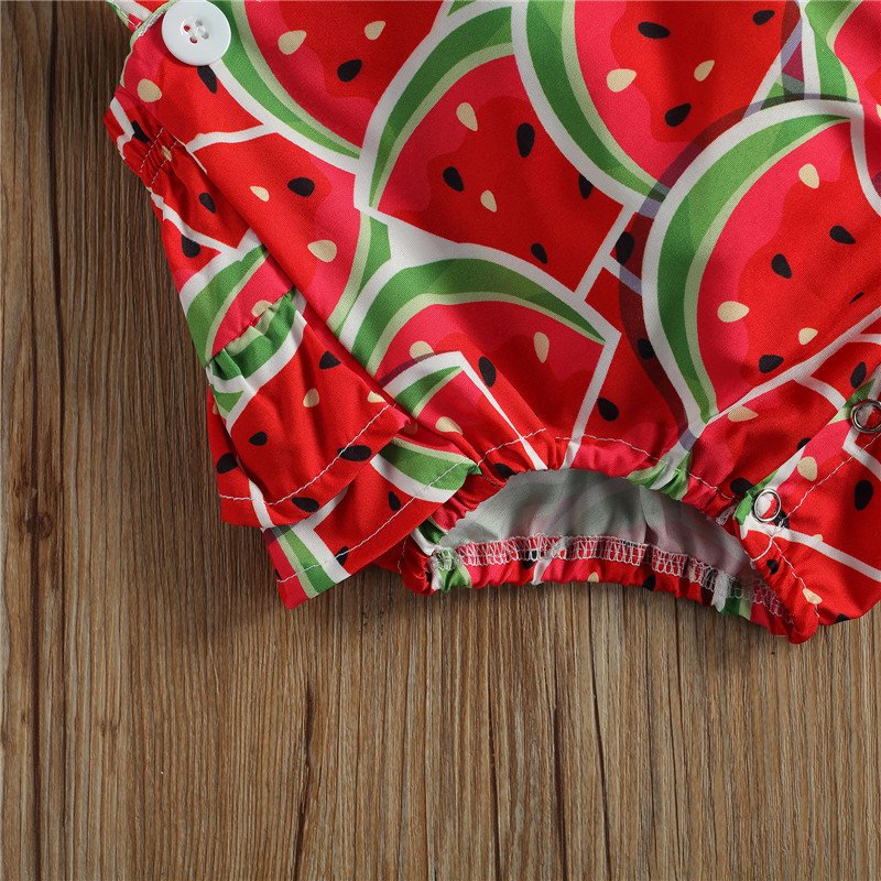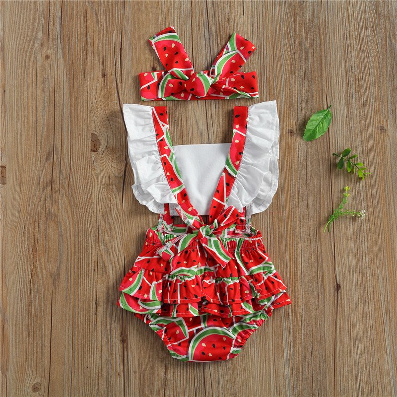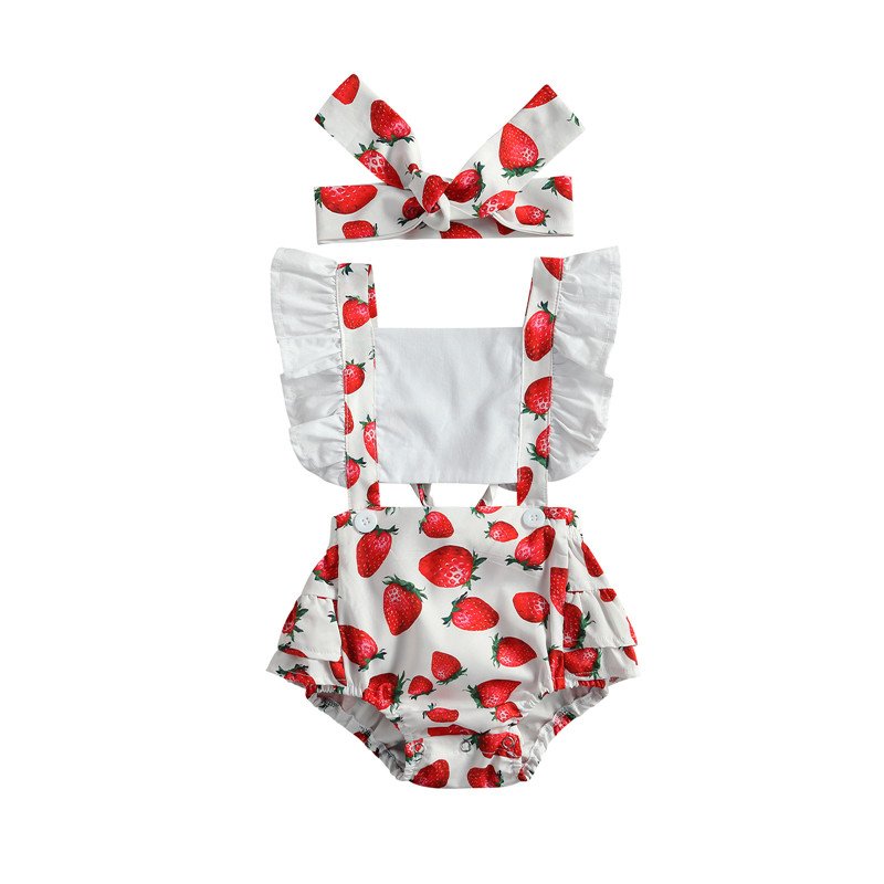Baby Girls Fruit Watermelon Strawberry Printing Square Collar Flying Sleeve Cut Out Romper With Headband Set