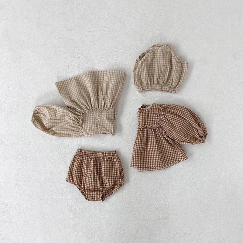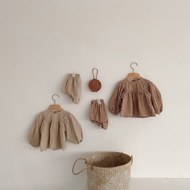 Baby Girls Little Plaid Infant Puff Sleeve Blouse And Bloomer 2 Pcs Set