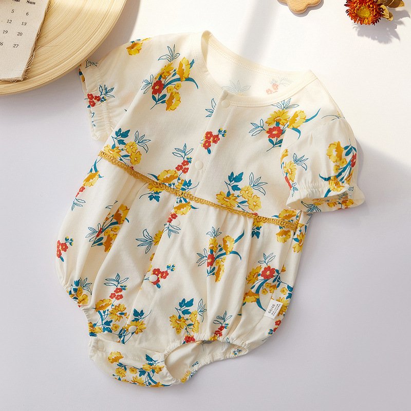 Baby Girls Pastoral Flower All Over Print Single-breasted Short Sleeve Romper