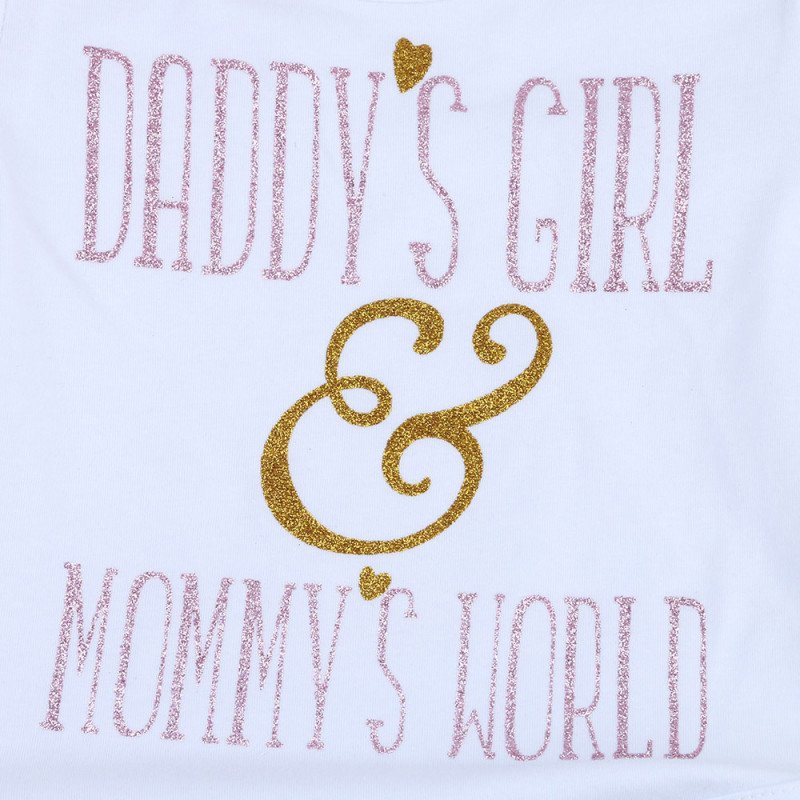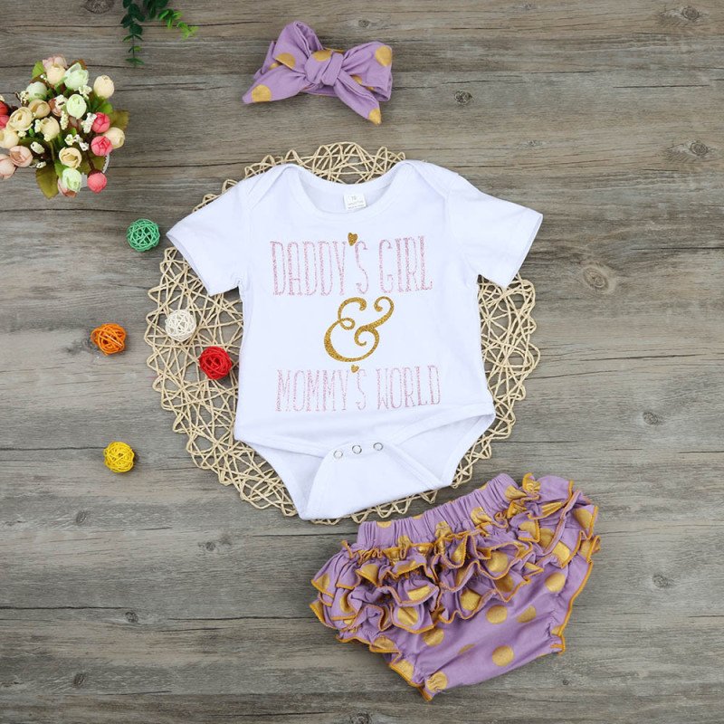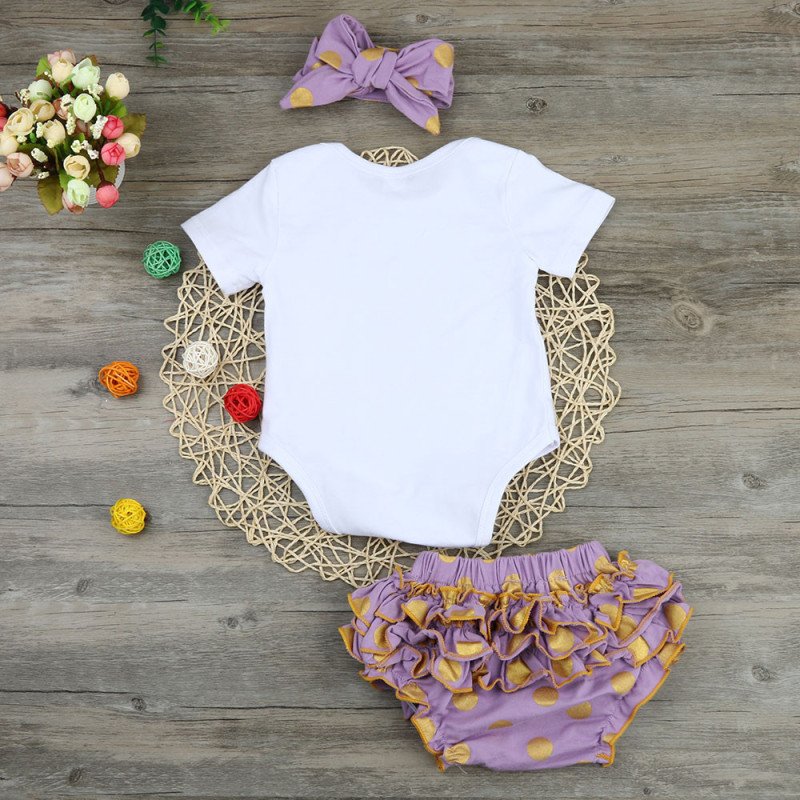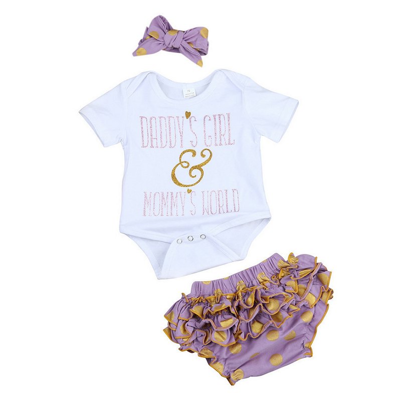 Baby Girls Round Neck Short Sleeve Letter Pattern Romper And Polka Dot Ruffled Shorts With Headband Set