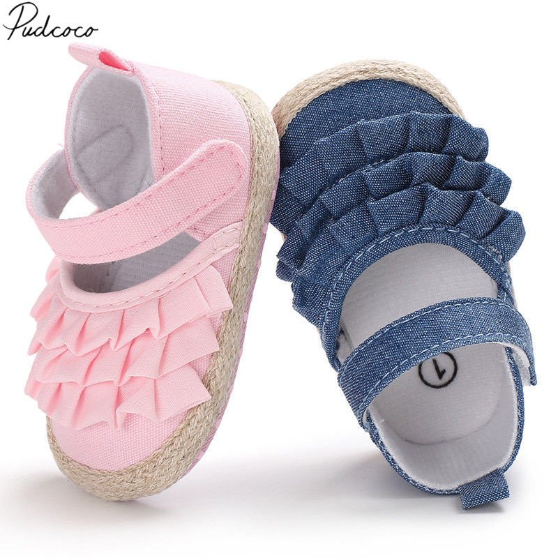 Baby Girls Simple Solid Color Mesh Ruffled Anti-slip Soft Bottom Velcro First Walkers