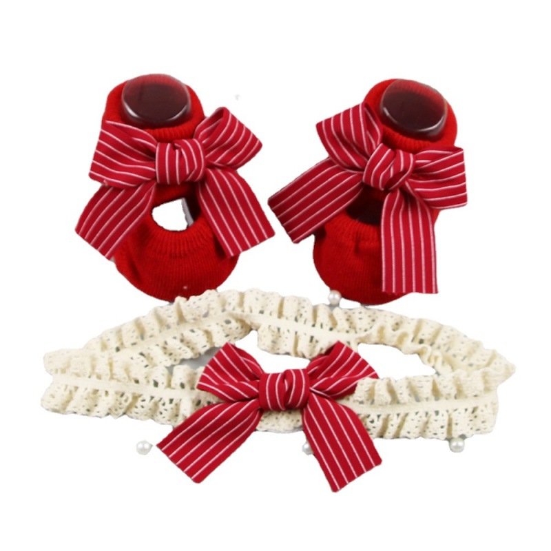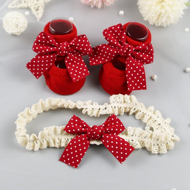 Baby Girls Sweet Big Bow Design Dispensing Floor Socks With Lace Headband Hair Accessories