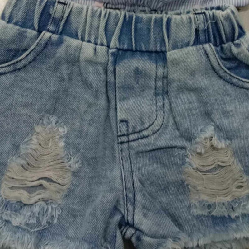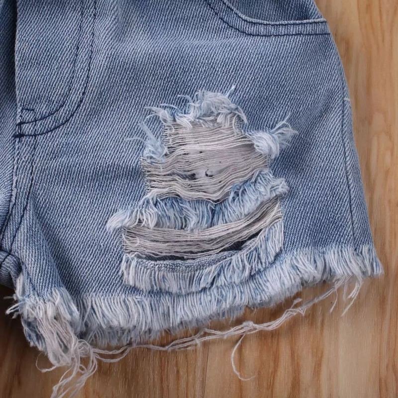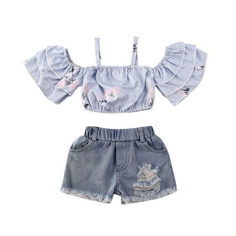 Baby Girls Sweet Flower Pattern Ruffled Cool-shoulder Elastic Top And Hole Design Denim Shorts Set