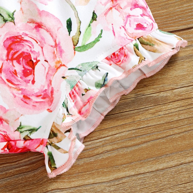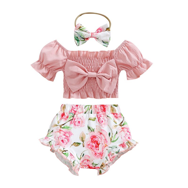 Baby Girls Sweet Off-the-shoulder Puff Sleeve Bow Top And Flower Print Shorts Two-piece Set