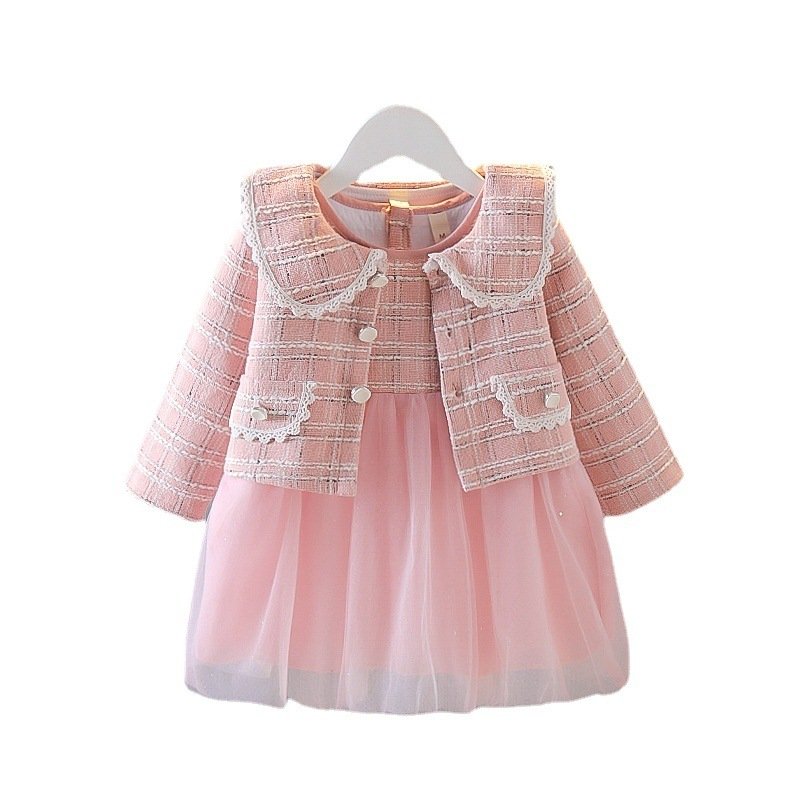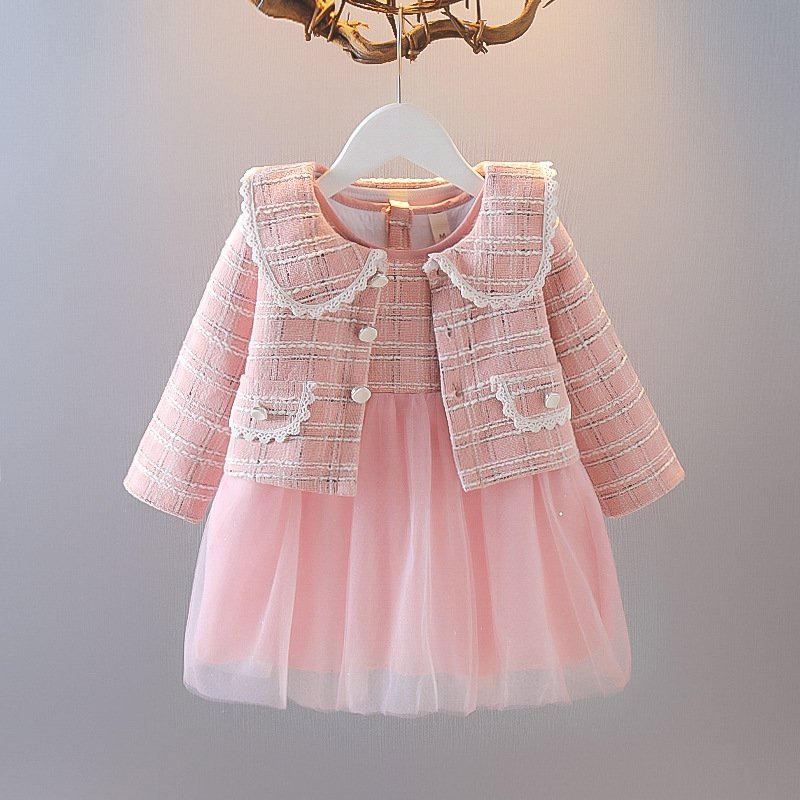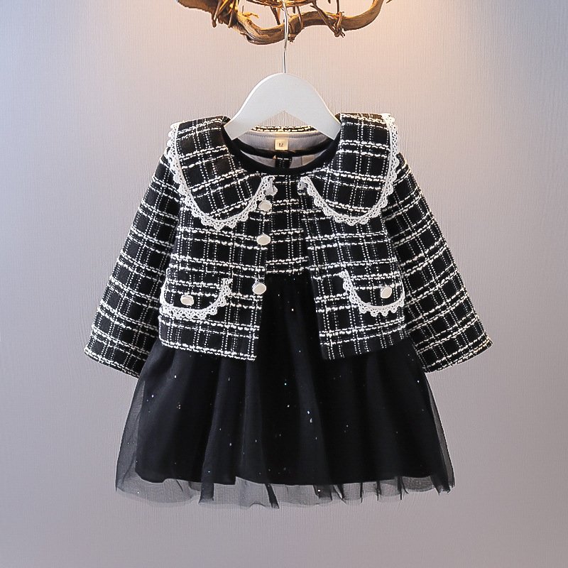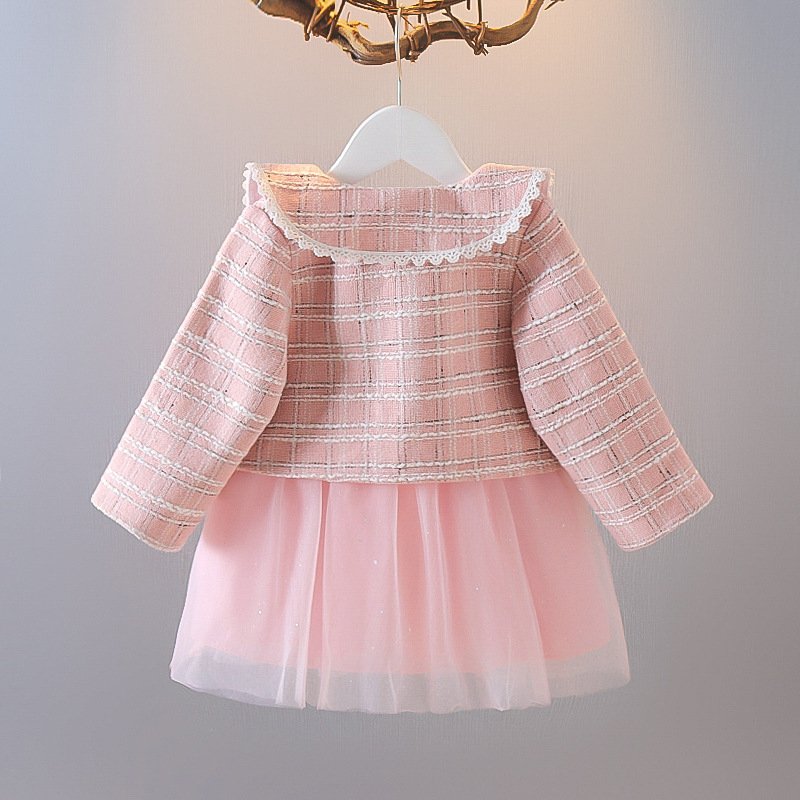 Baby Girls Sweet Plaid Mesh Spliced Dress And Doll Collar Lace Design Coat Set