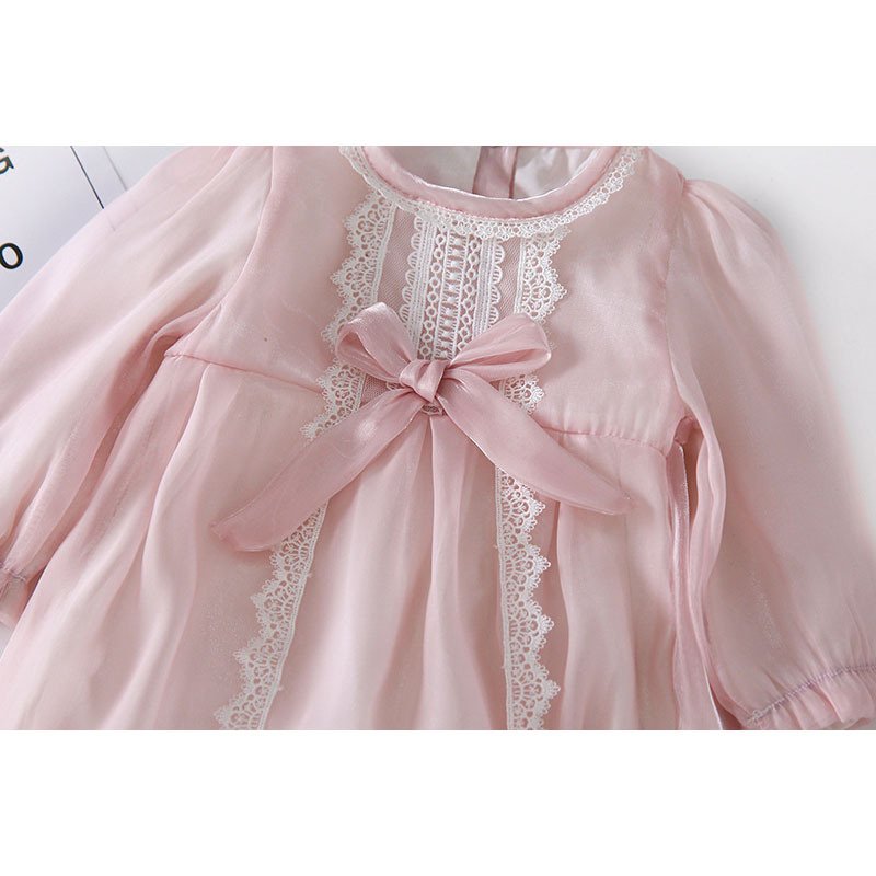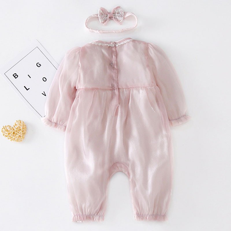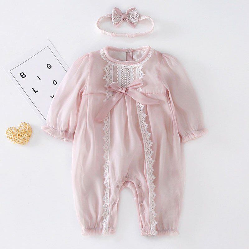 Baby Girls Sweet Solid Color Long Sleeve Lace Jumpsuit With Headband