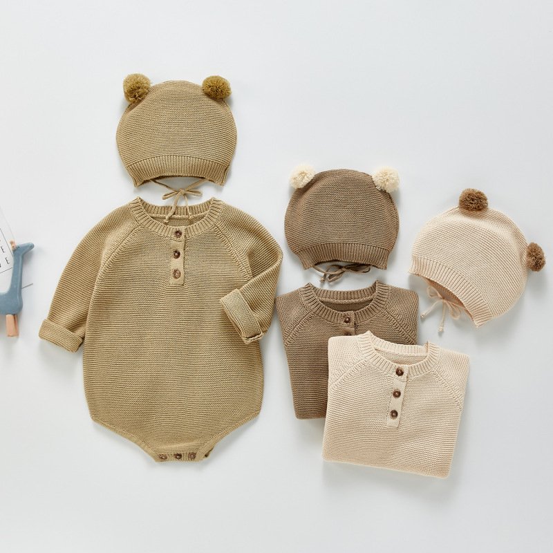 Baby Simple Round Neck Long Sleeve Solid Color Romper With Hat