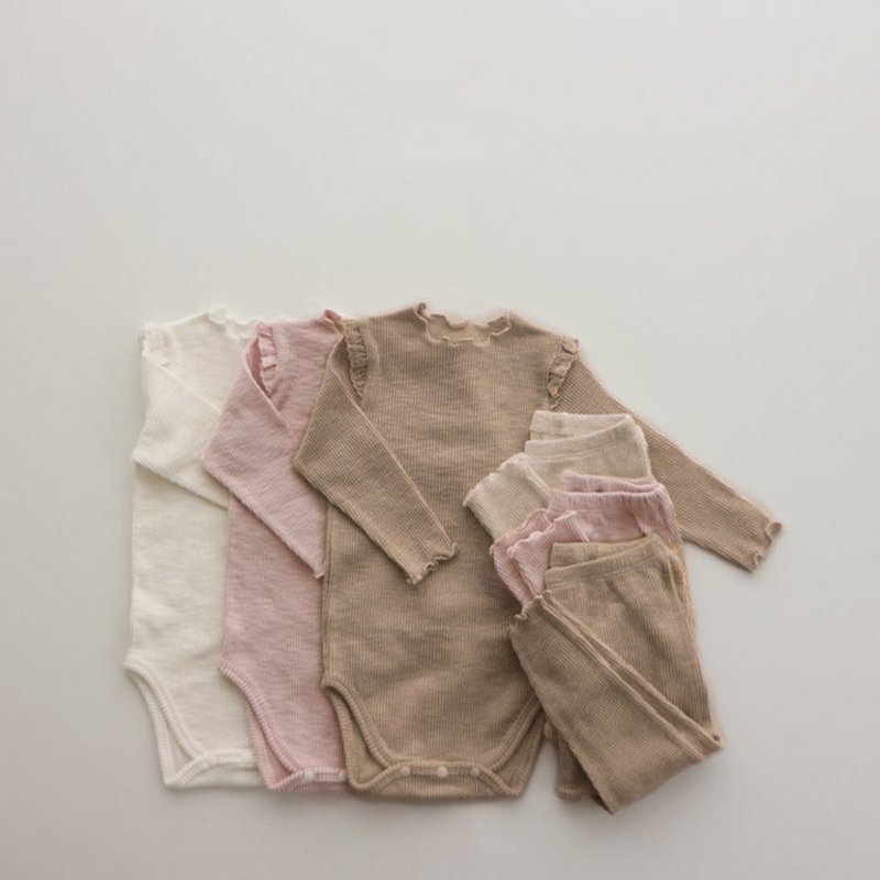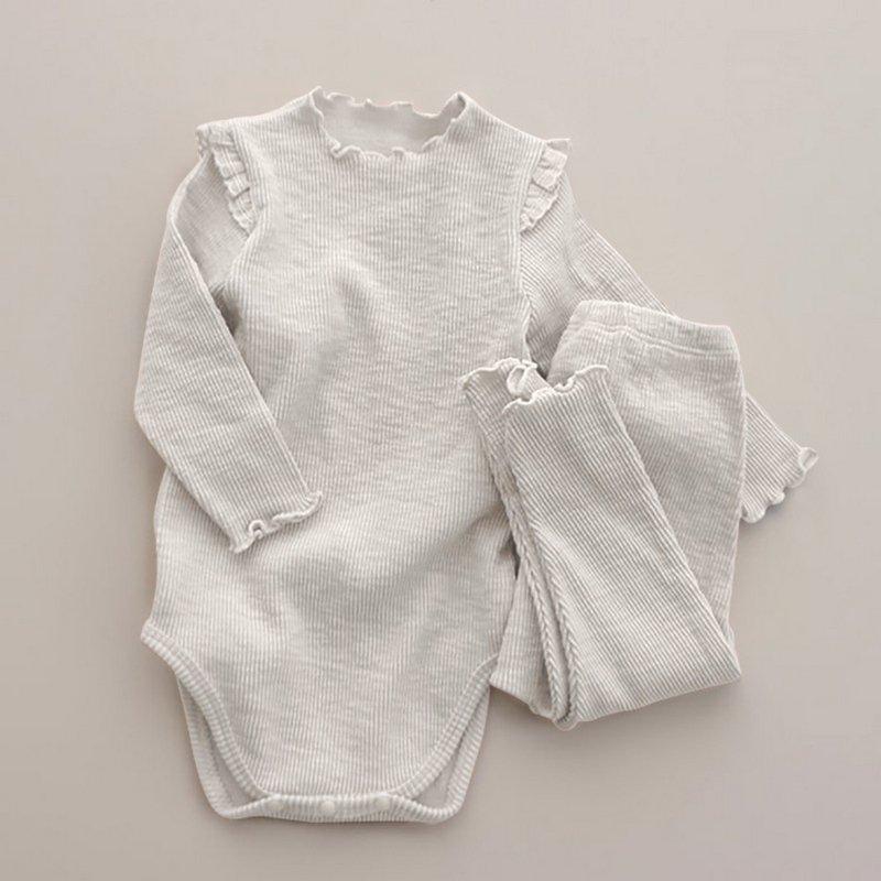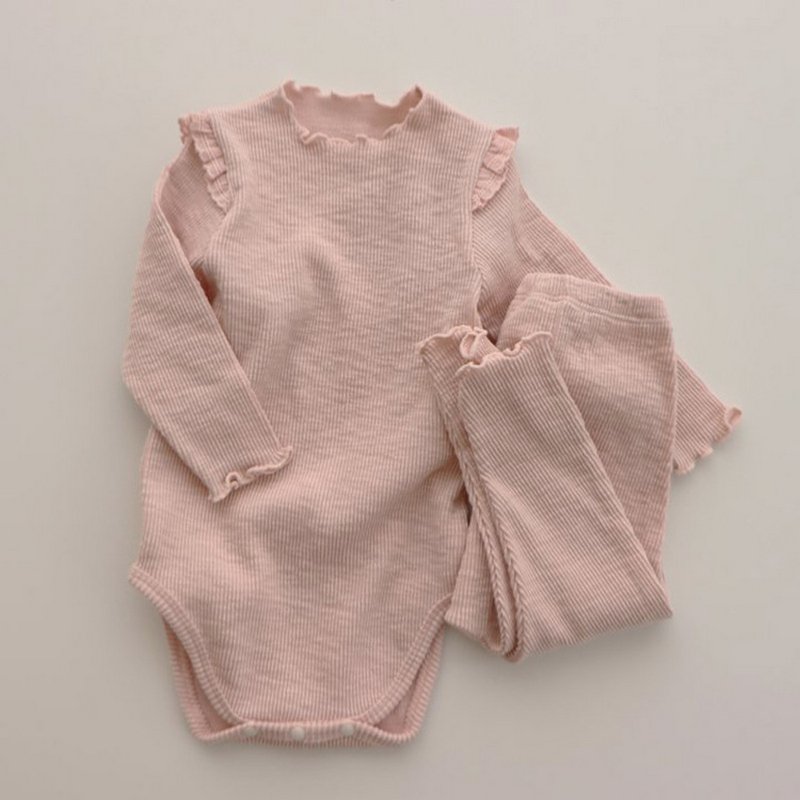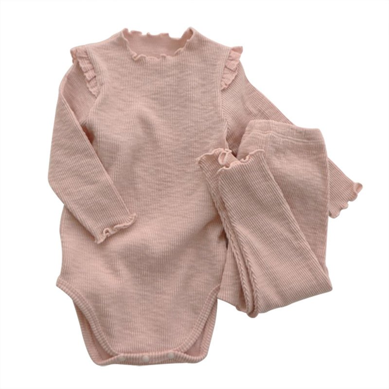 Baby Simple Stringy Selvedge Round Neck Long Sleeve Solid Color Romper And Pants Pajama Set