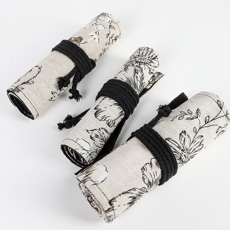 Black Peony Print Canvas Pen Holder Large Capacity Pencil Bag