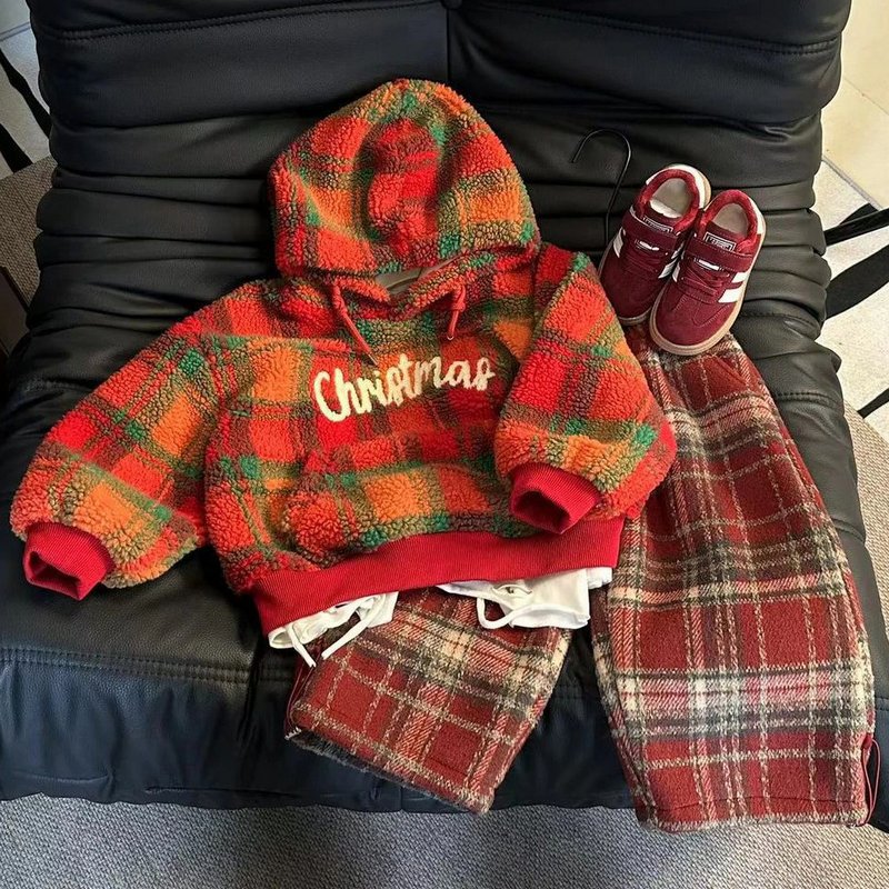 Boys And Girls Fashion Winter Plaid Fleece-Lined Warm Long-Sleeve Hoodies Loose Pants Two-Piece Set