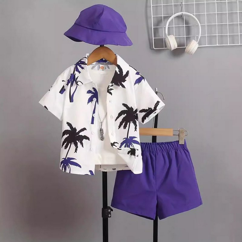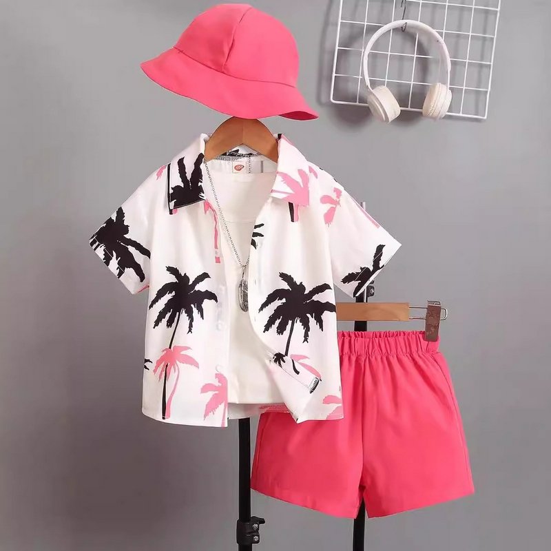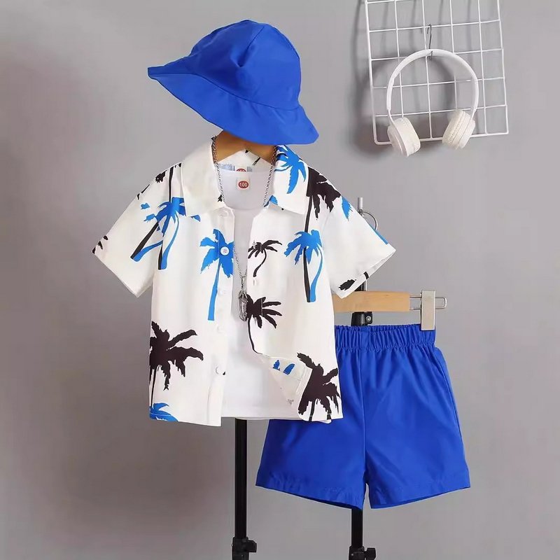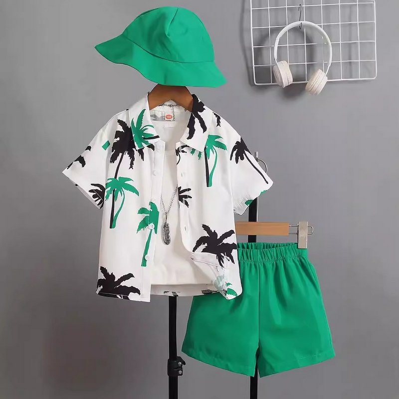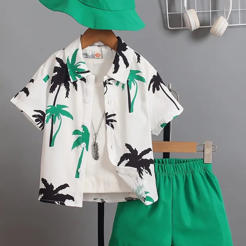 Boys Fashion Casual Coconut Tree Print Short Sleeve Blouse Loose Shorts Two-Piece Set